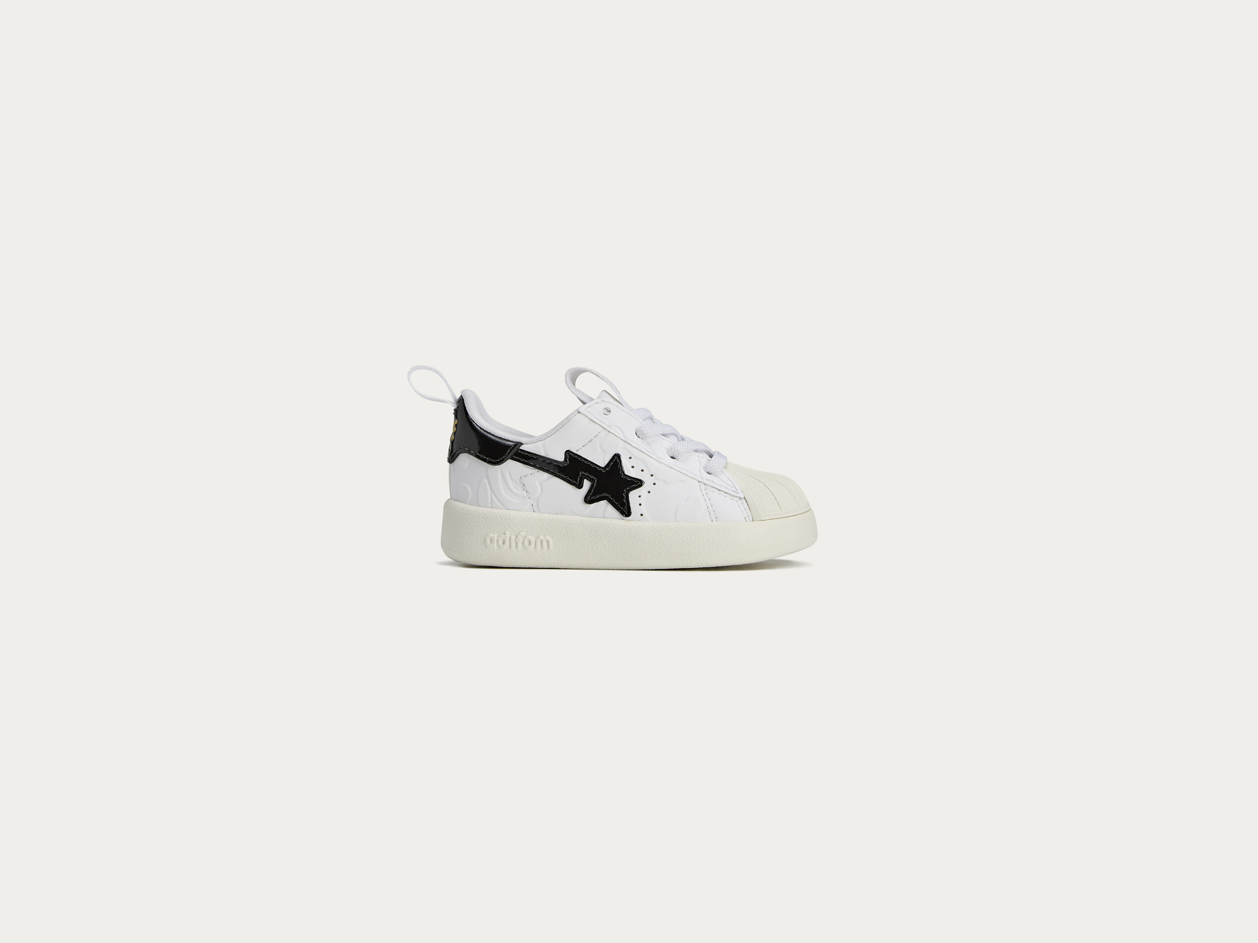 此次依然是以 Superstar 为蓝本打造,提供黑白、蓝白两款配色。其中黑白款是全家族尺码登场,可以看到童鞋版本配备了后跟鞋提。