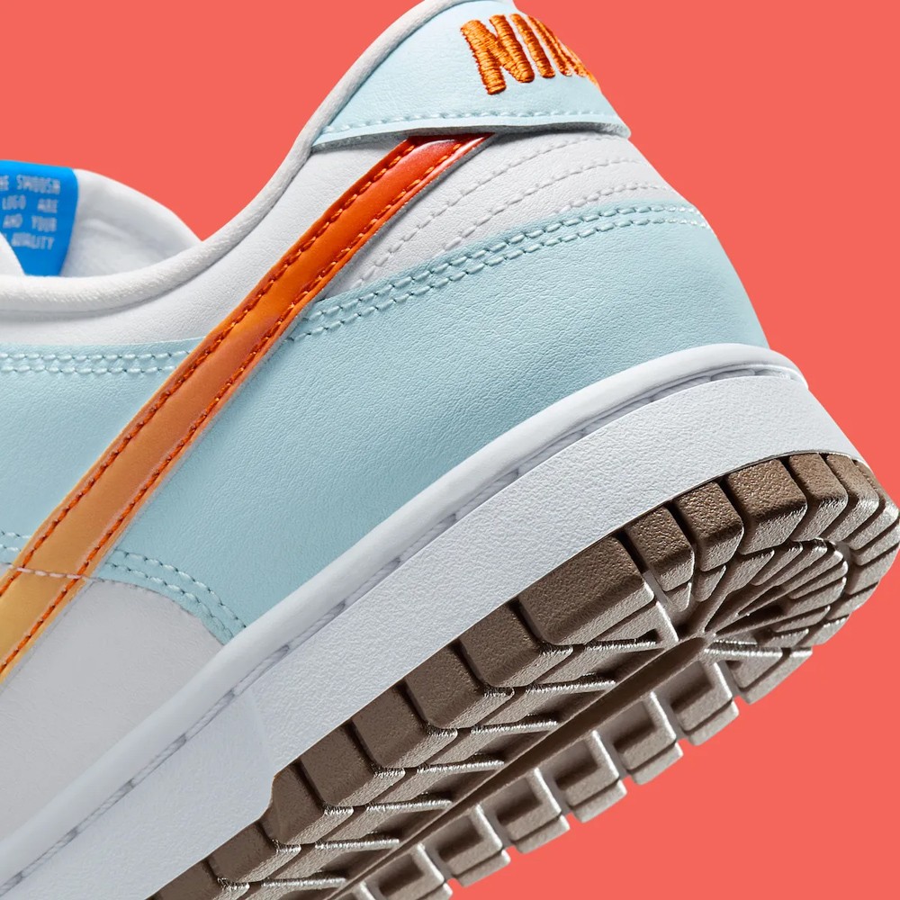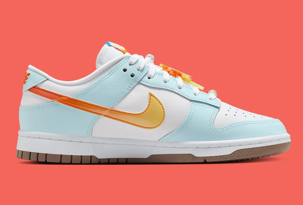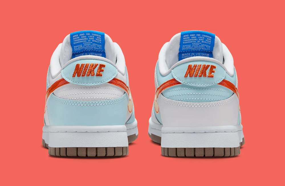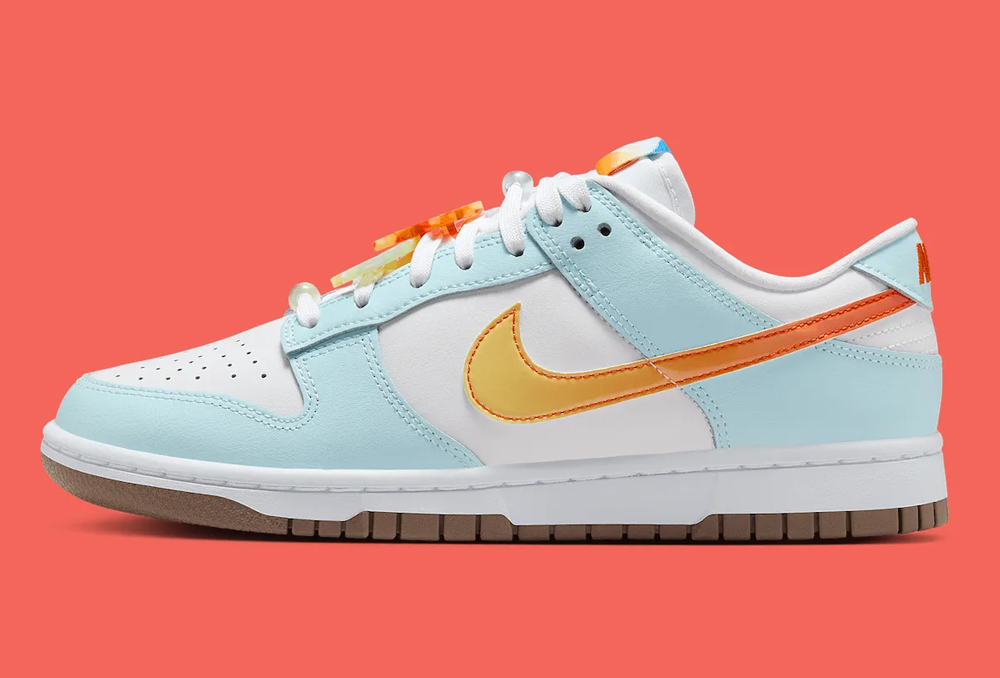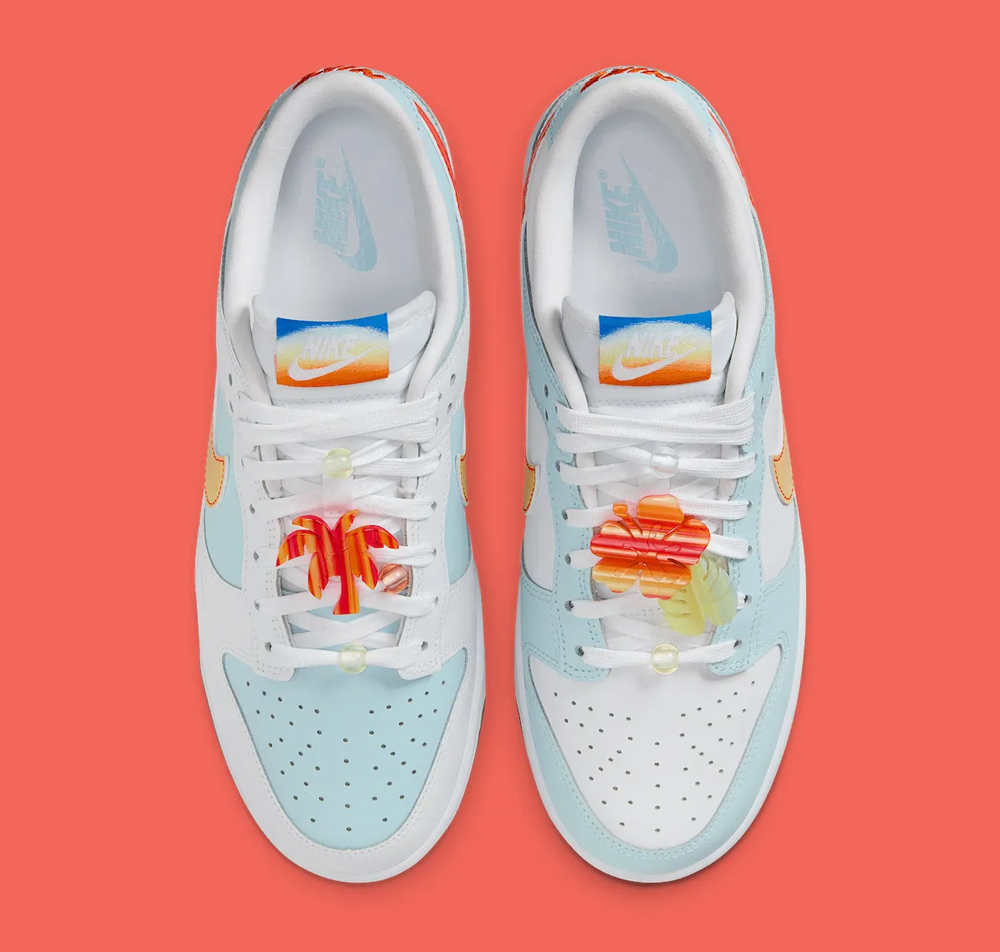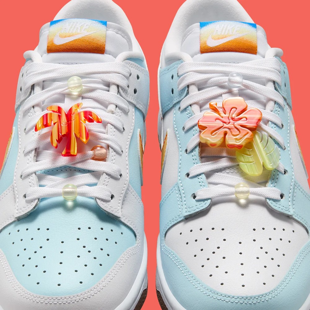 另一款 Dunk Low 则通过冰川蓝与白色构建鞋身,同样加入了可爱的鞋带扣元素,营造清爽俏皮的假日气氛。