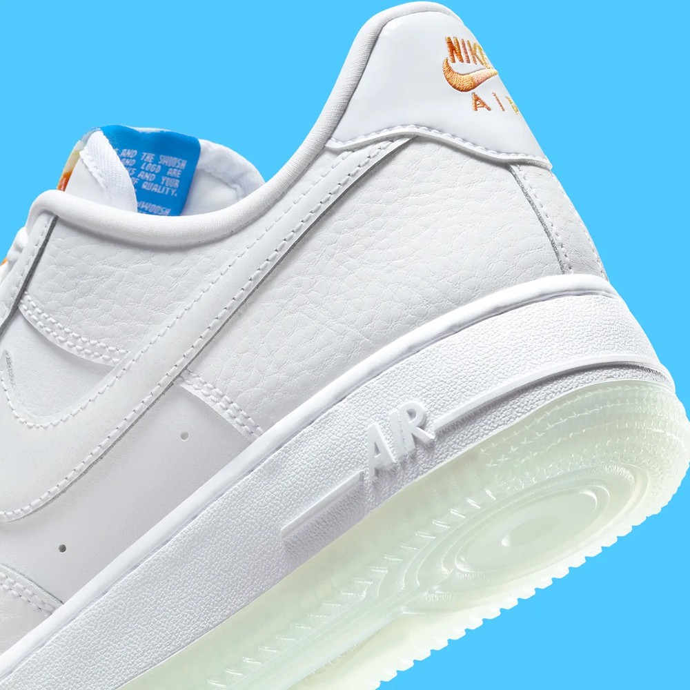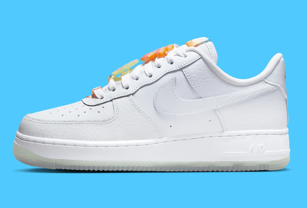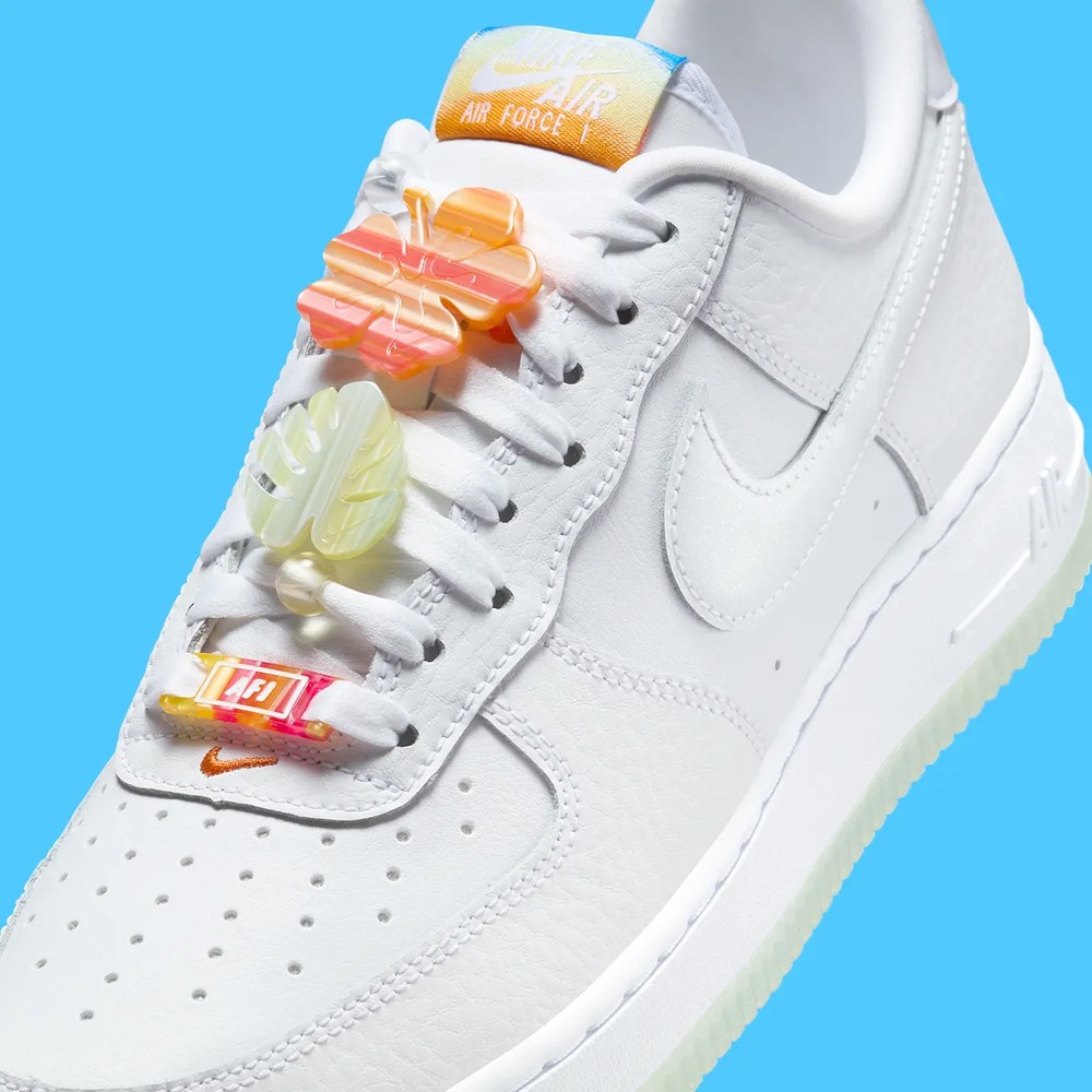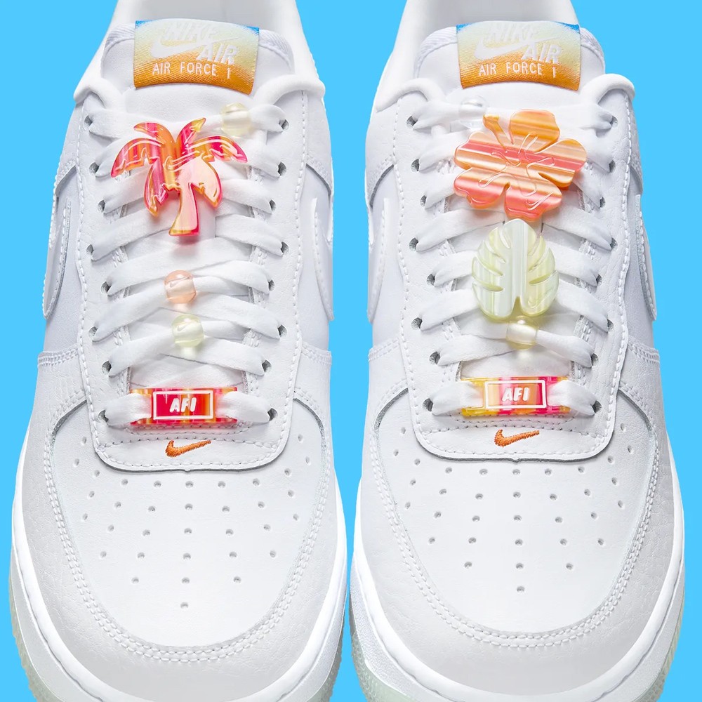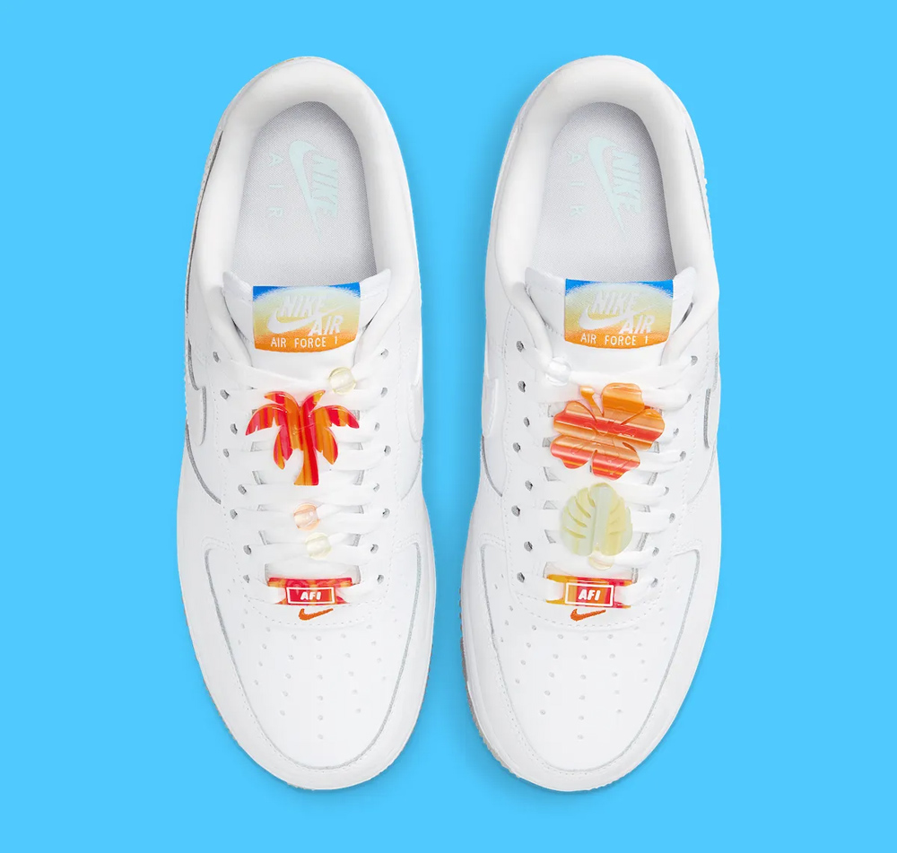 首先 Air Force 1 Low 采用熟悉的一席白色为底,鞋带扣加入棕榈树、鲜花与珍珠点缀,除此之外,鞋舌标签还装饰有海边日落图案,进一步烘托主题。