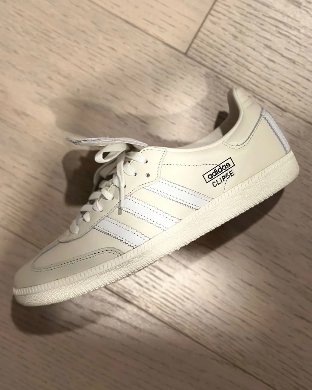 鞋型采用时下大热薄底鞋 Samba 为载体,米白鞋身辅以纯白三线点缀,营造浓郁的复古氛围。