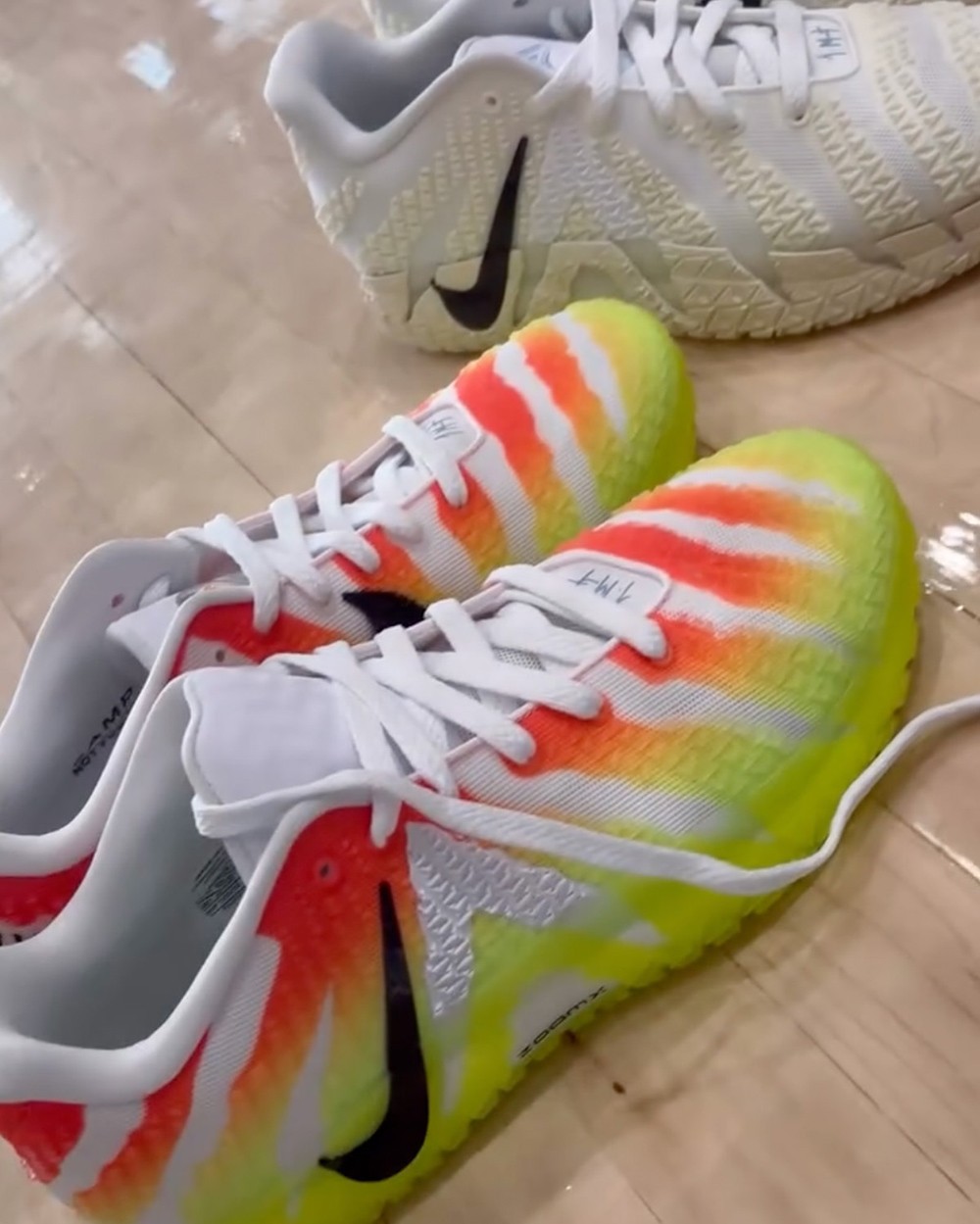 另一个则是白色为底,鞋面布满 JA 专属 Logo,些看鞋舌与中底、及后跟,都采用彩虹效果刻画文字,活力十足。