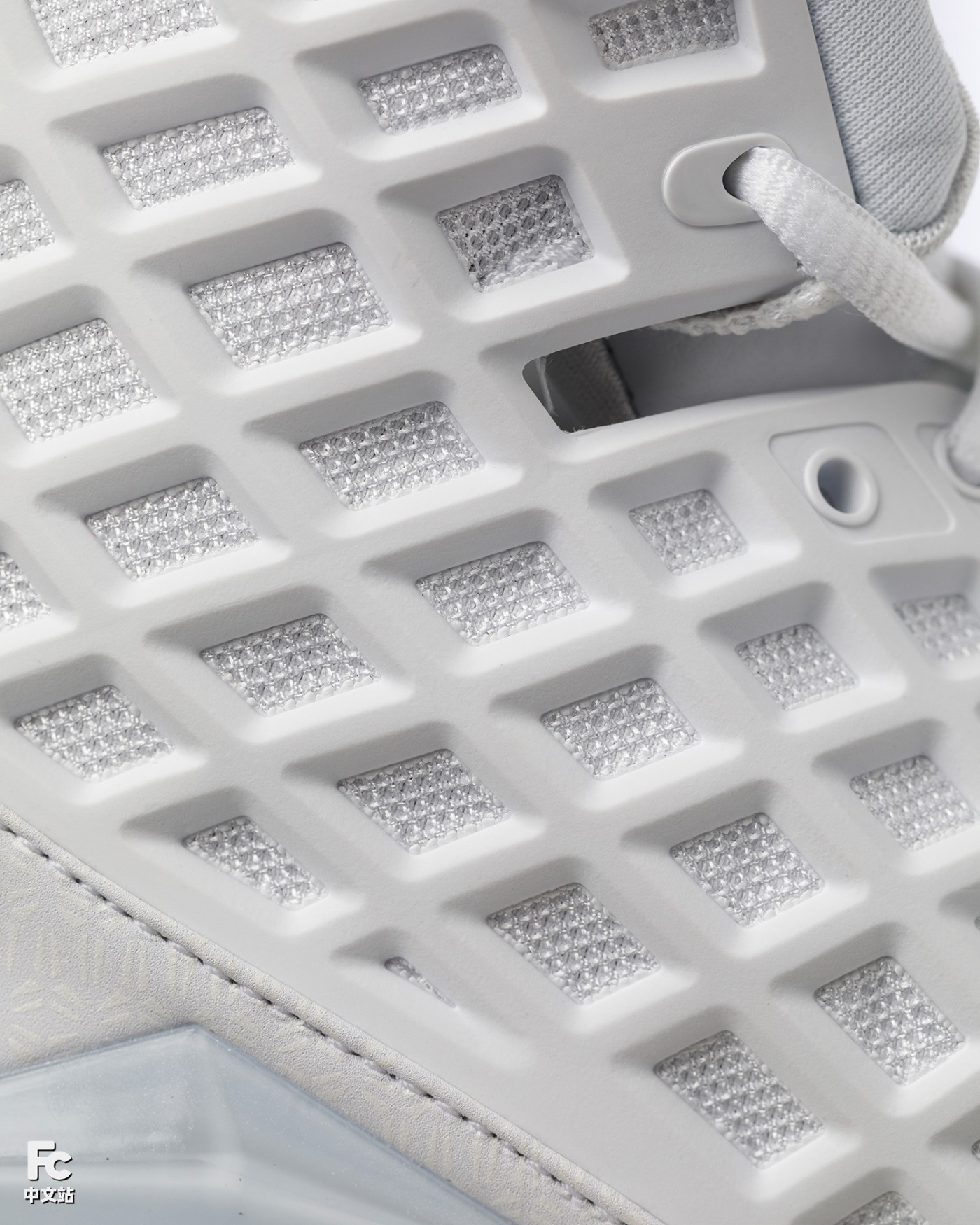首先是网格状鞋身框架下方,选用了更加透气的底层面料,大幅提升透气性。