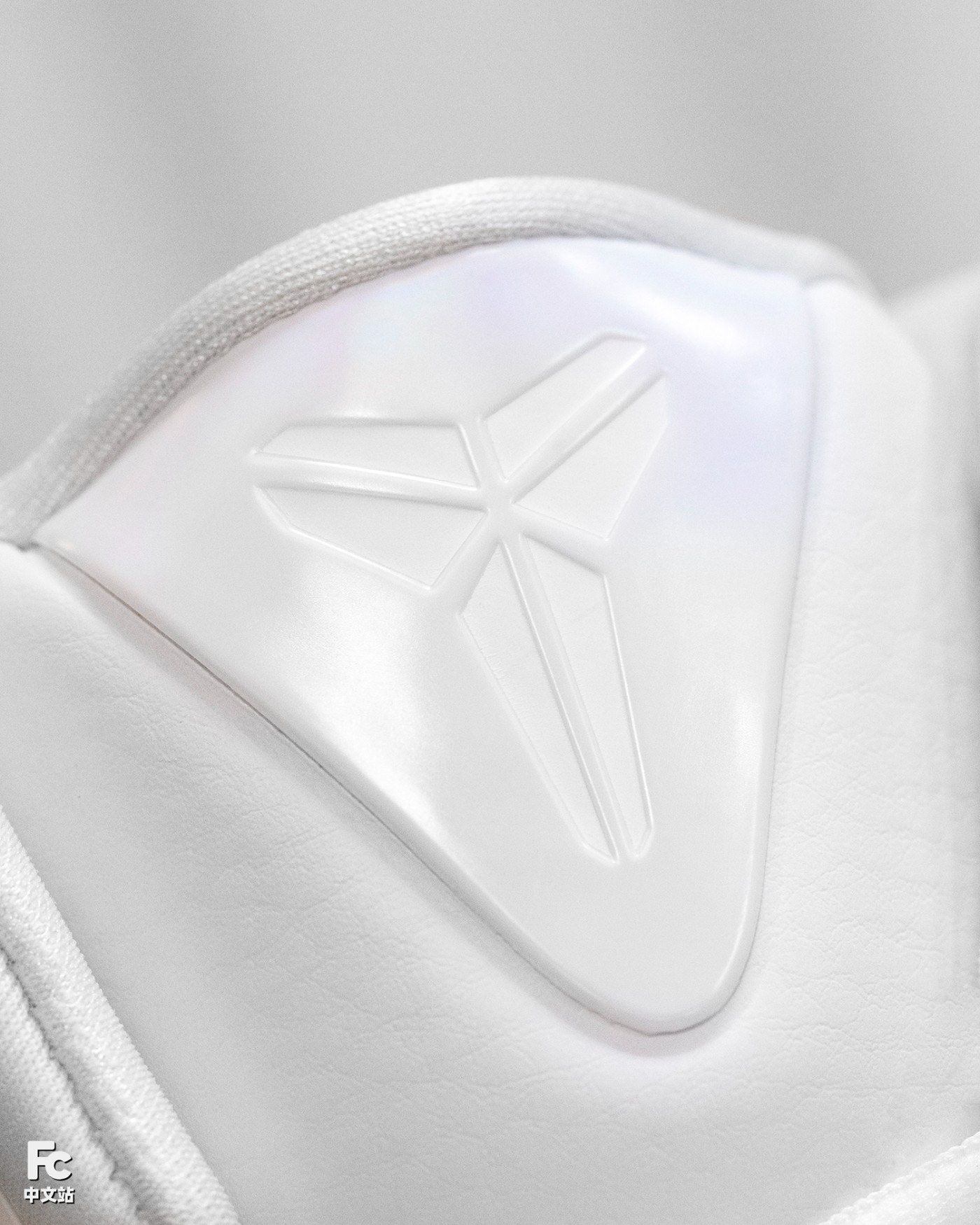 细看后跟 TPU 稳定片采用冰蓝示人,整个后跟部位的白色皮革,都暗藏满印科比剑鞘 Logo。