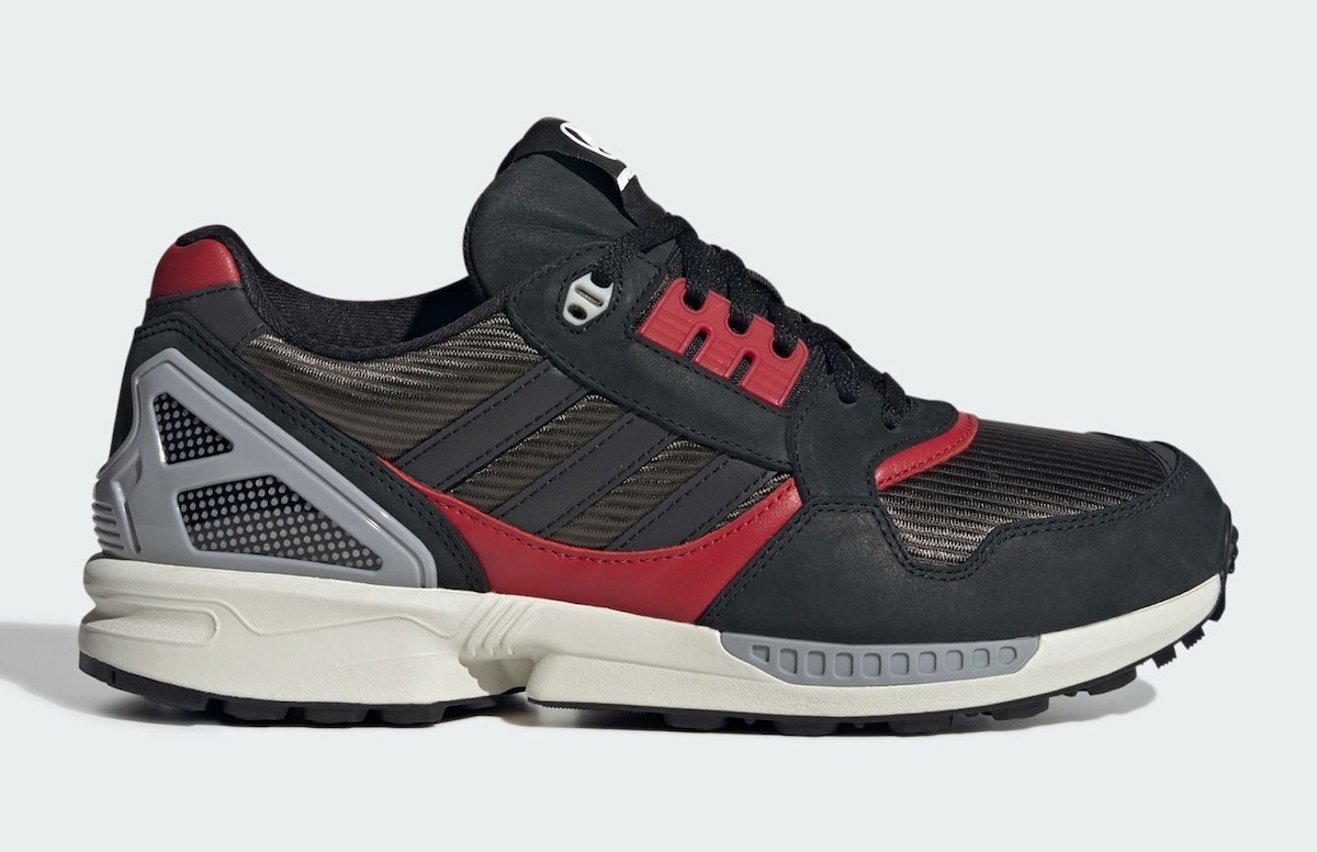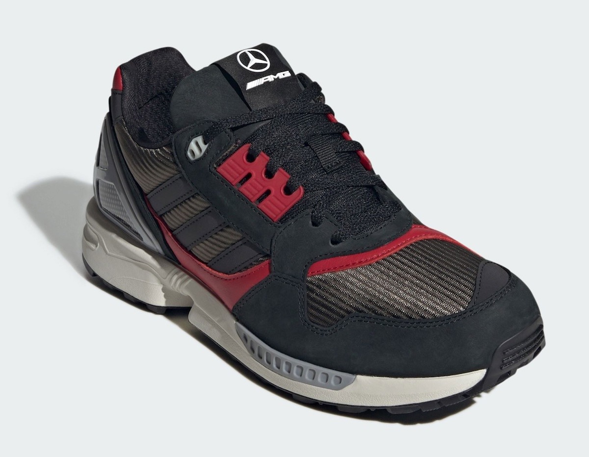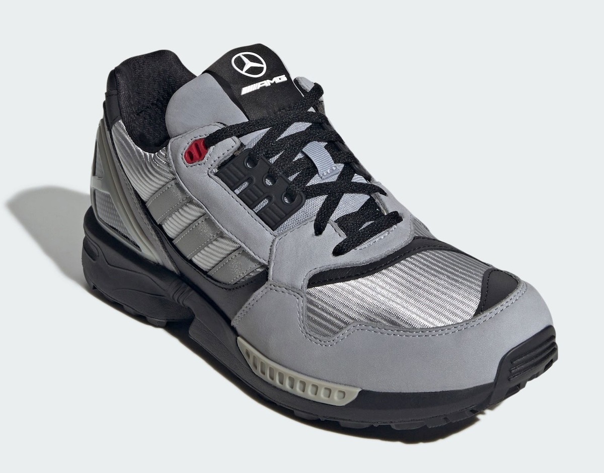 ZX 8500 融合了 ZX 8000 和 ZX 9000 的经典元素,黑红配色(货号 KJ8964)再现了梅赛德斯车队的赛车服,银灰配色(货号 KJ8965)则更为清爽,也更便于穿搭。