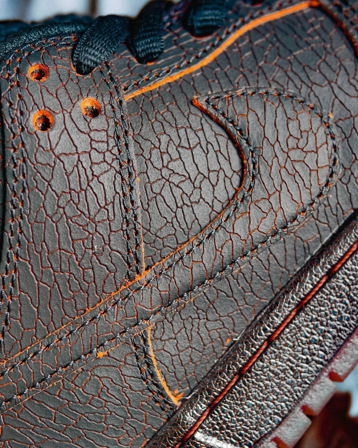 龟裂纹理呈现在中底和鞋面上,营造出压抑阴郁的氛围,编织质感鞋舌也赋予鞋款独特质感。