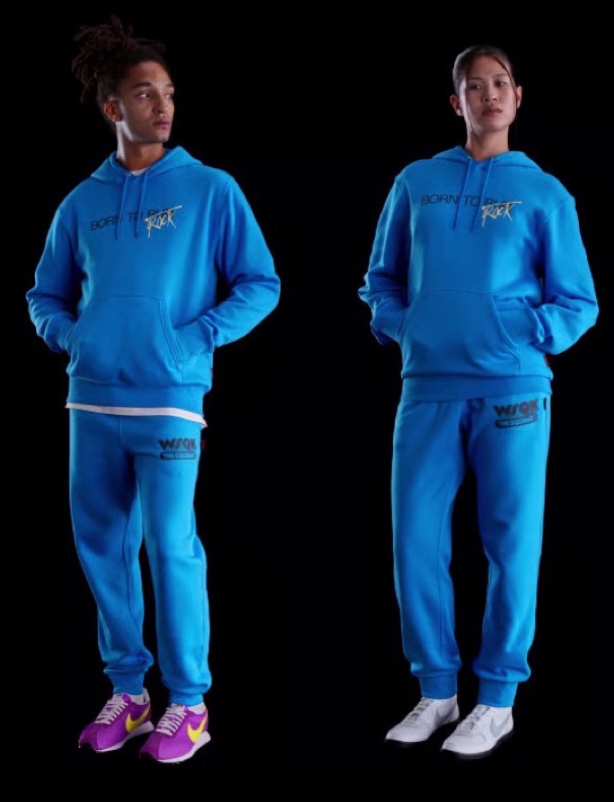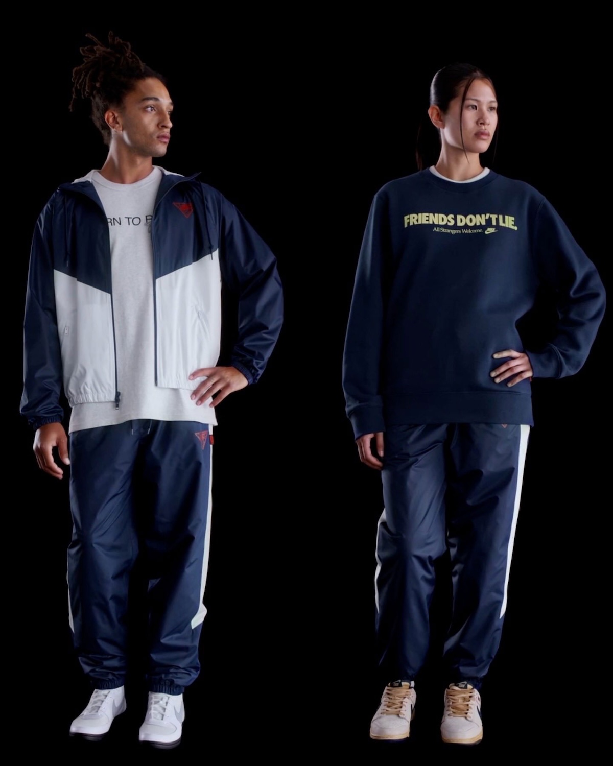 服装系列包括复古风格的运动夹克、运动服、连帽衫和 T 恤,印有 “Friends Don' t Lie”,“Born to Run” 的短语。