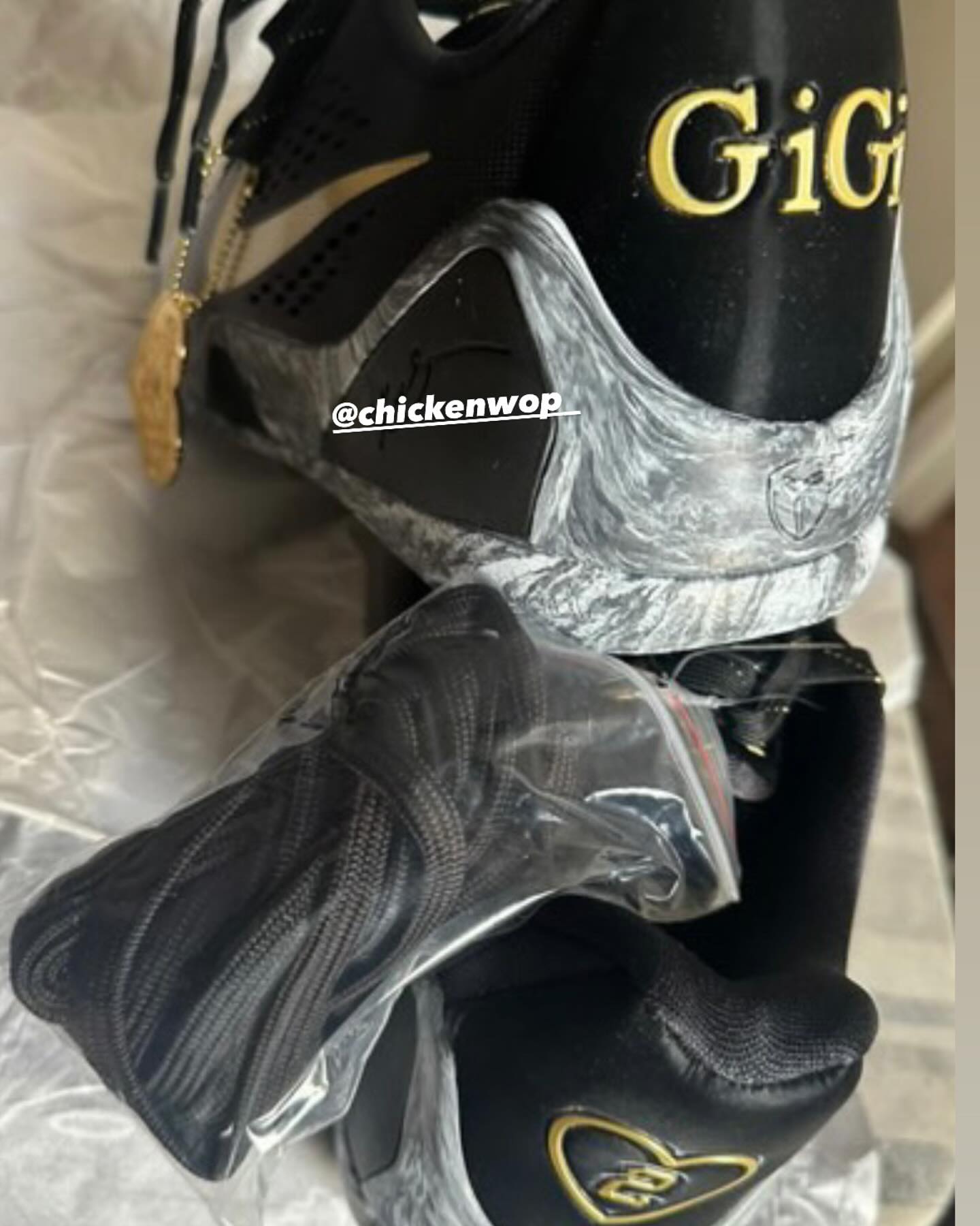 EM 版本特有的工程网面辅以色彩过渡的方式呈现,GIGI 文字与心形环绕的 2 号球衣号码,分别点缀于左、右后跟位置,除此之外,可以看到还附赠一块与以往相同的心形金色吊牌,突显专属配色身份。