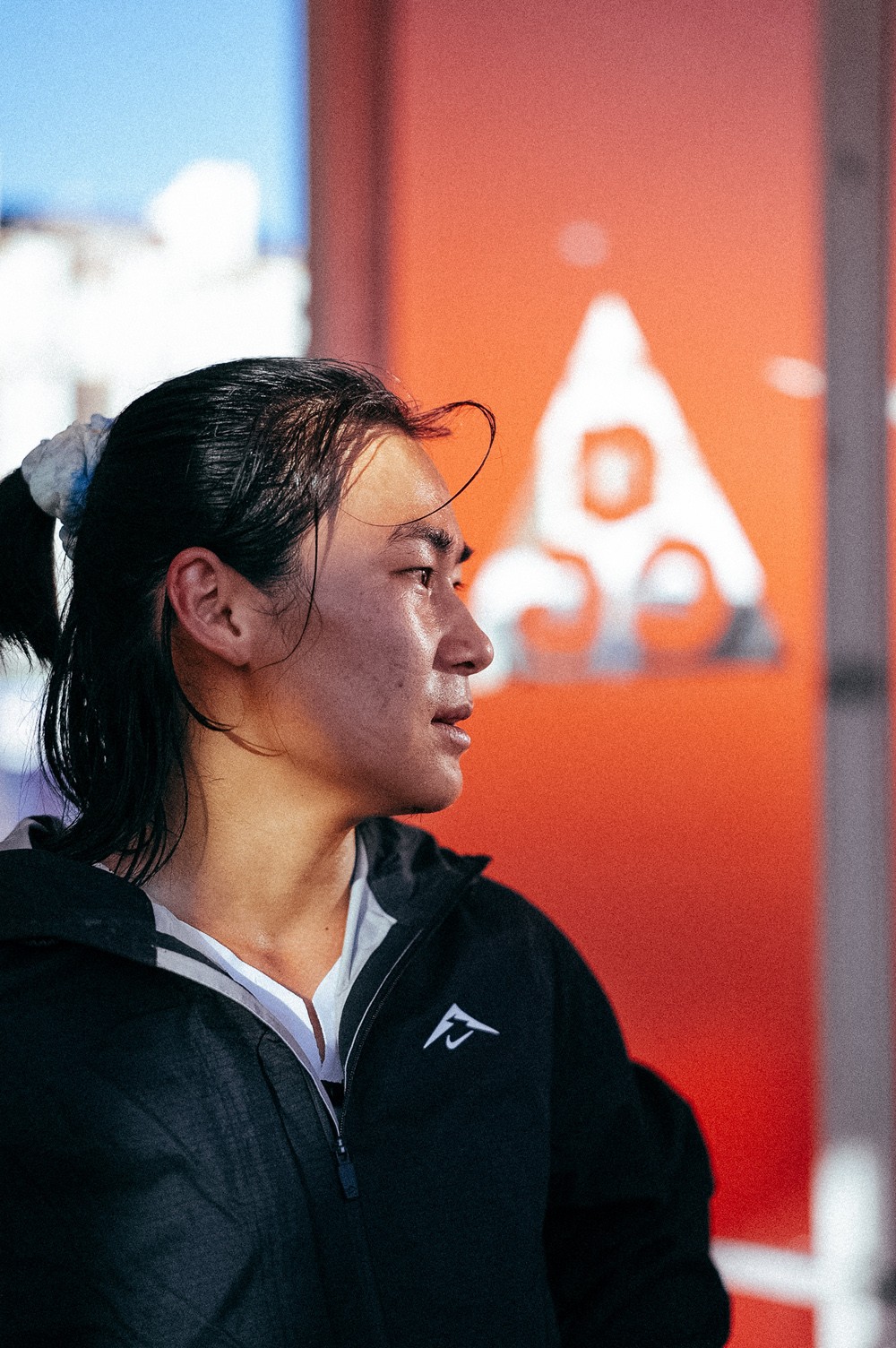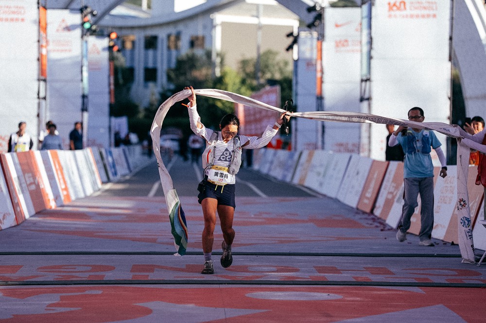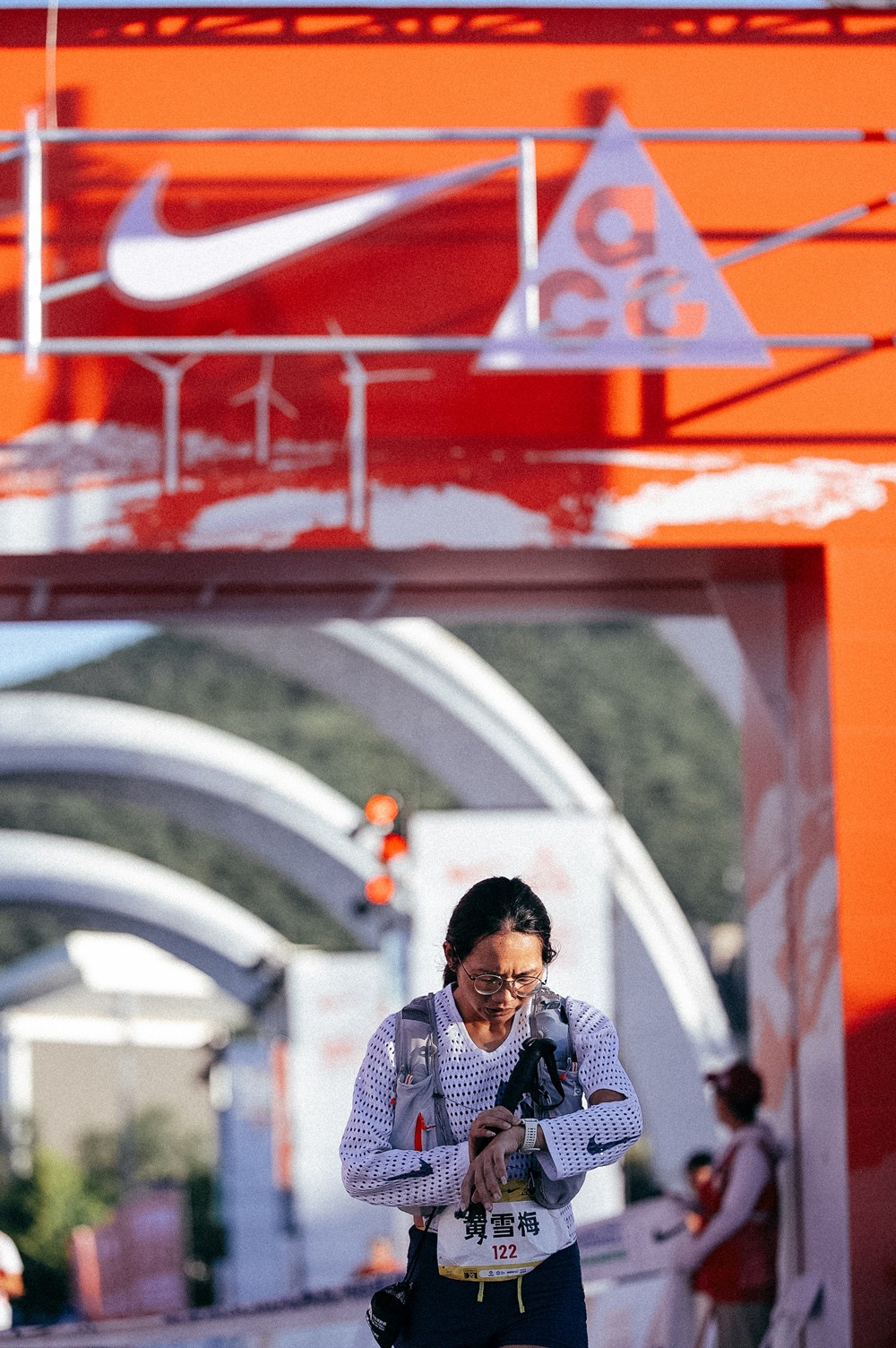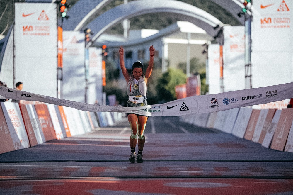耐克运动员黄雪梅获得耐克 ACG 崇礼 168 超级越野赛 70 公里组女子第一,身着西部 100 冠军同款的 ACG 洞洞上衣和 Nike Ultrafly。