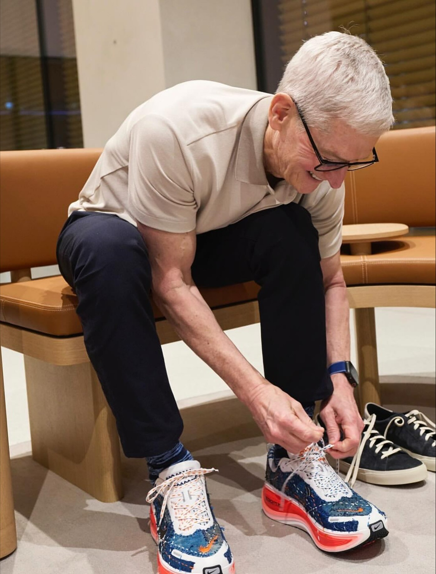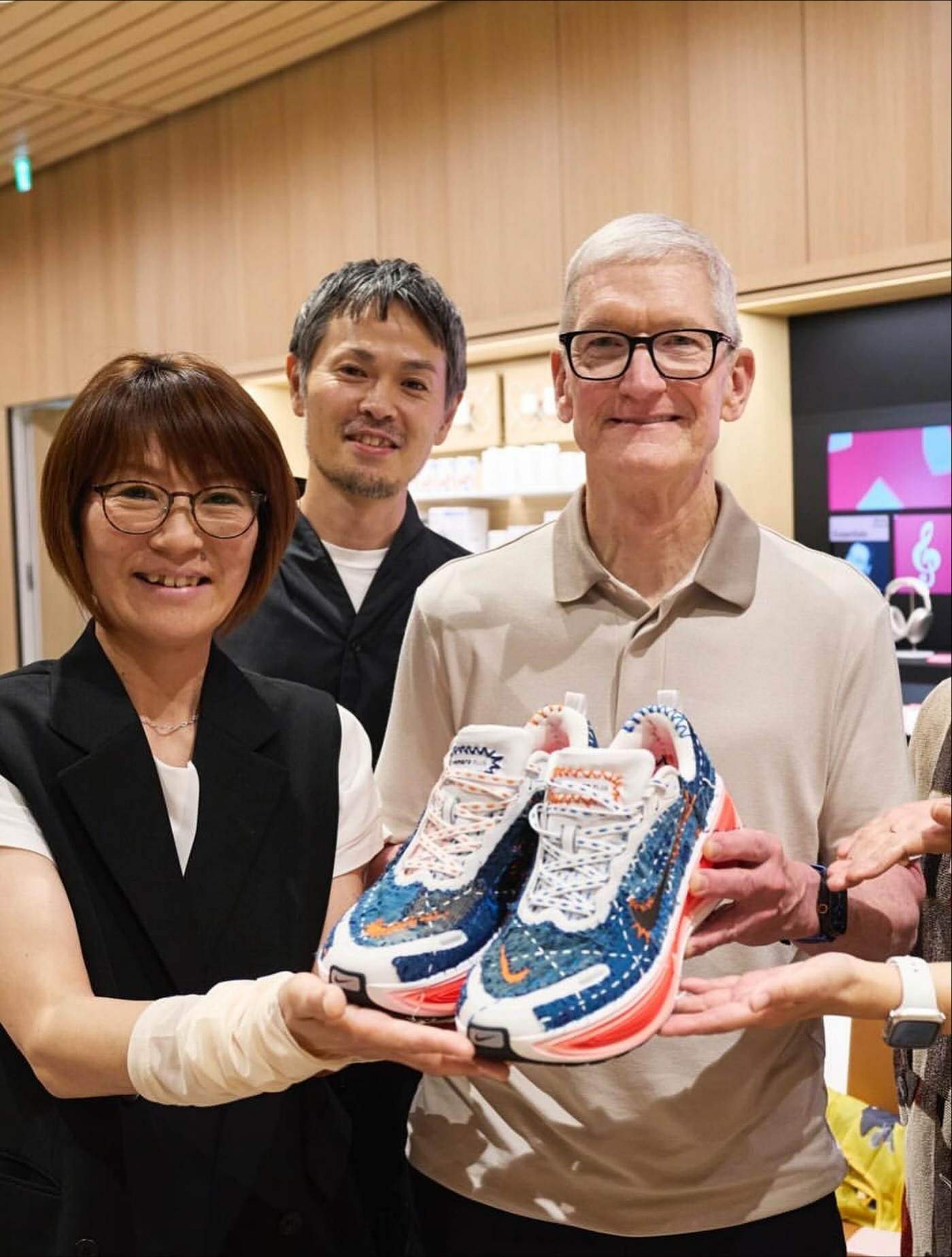 不久前在东京银座 Apple Store 重新开业,库克就穿着一双定制版 Nike Vomero Plus 亮相。