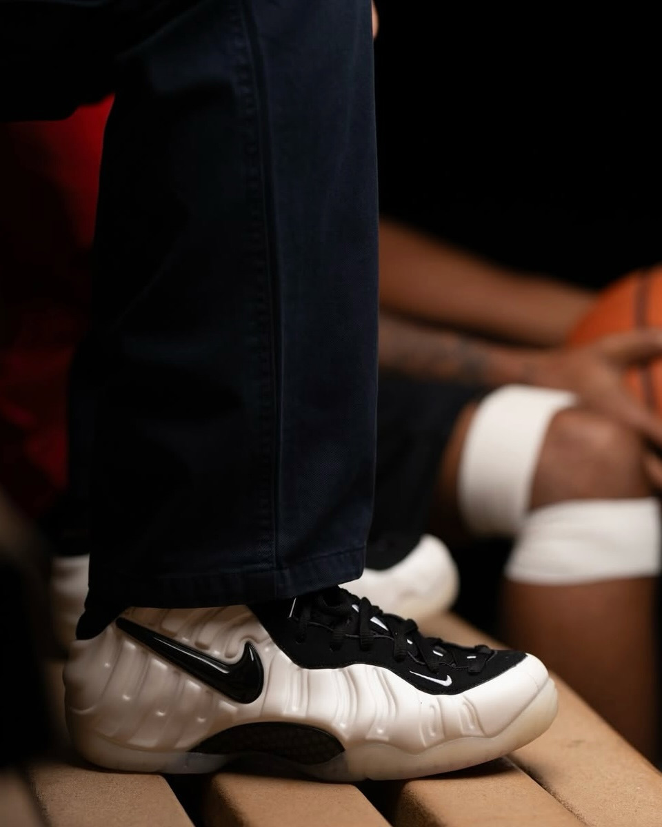 他先是上脚了今年回归复刻的重头戏之一——Nike Foamposite Pro “Pearl” 珍珠泡(奶泡)。
