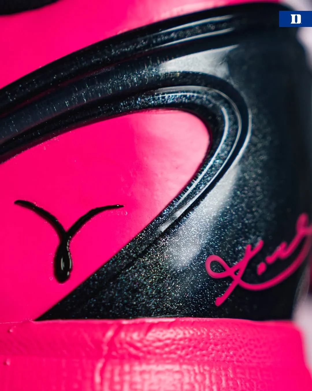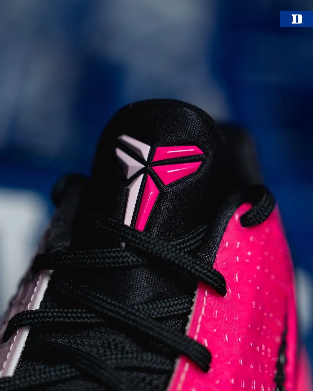 但这双全新的 Nike Kobe 6 “Kay Yow” 却几乎没有任何杜克大学的元素和色调,鞋帮上的粉丝带标志,表明了它是一双正统的 Kay Yow 主题配色,是同 Kay Yow 抗癌基金会合作的产物。