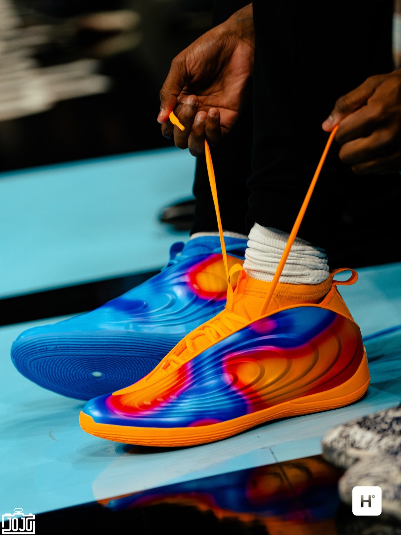 这双 PE 版本的鞋面采用了类似热力图的视觉设计,通过蓝、橙色调的渐变交织,生动还原了俄克拉荷马地区多变的气候特征。