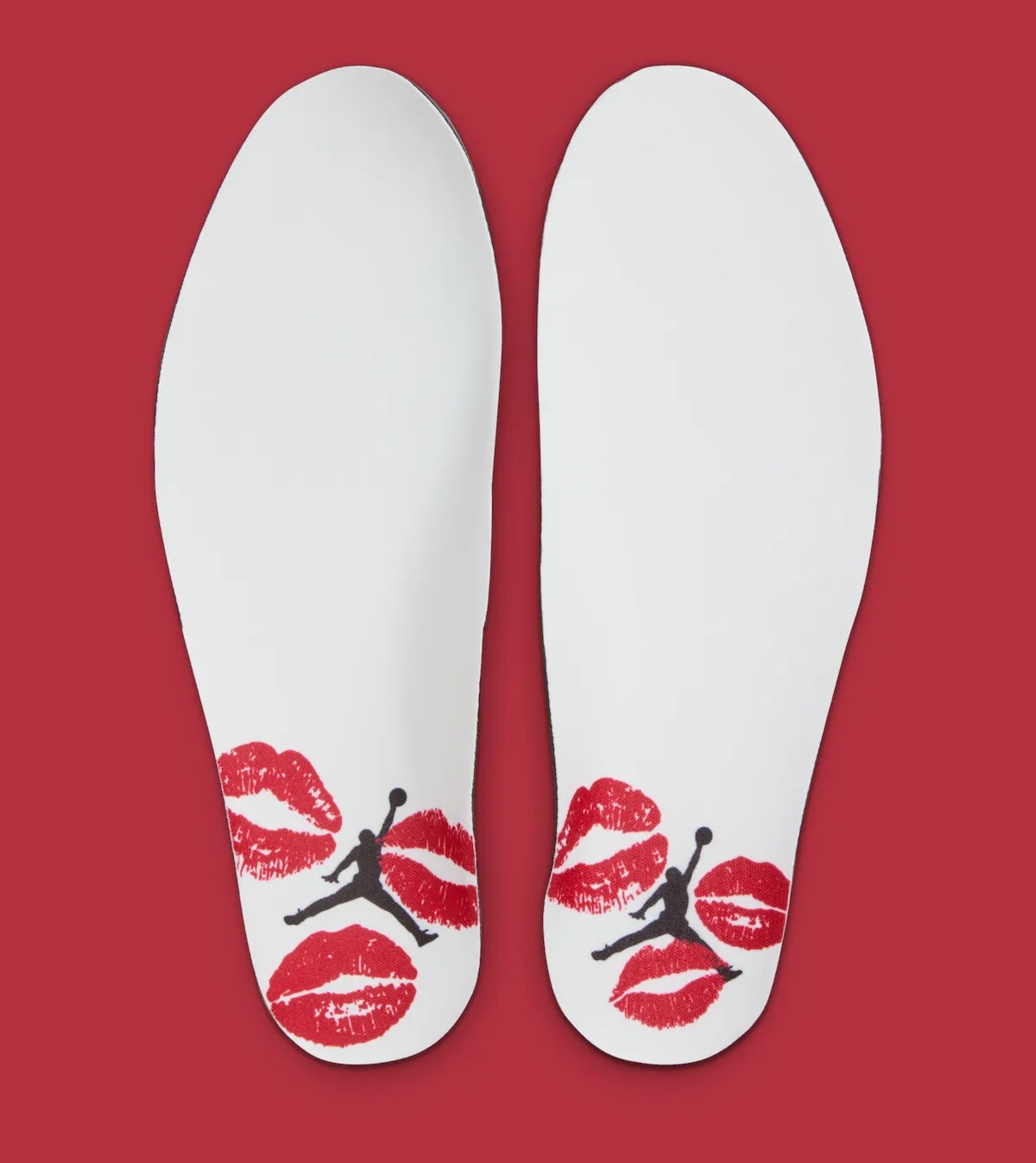 鞋垫上的 Jumpman Logo 被巨大的红色唇印包围,鞋舌内侧也隐藏了亲吻图案,呼应节日氛围,辨识度极高。