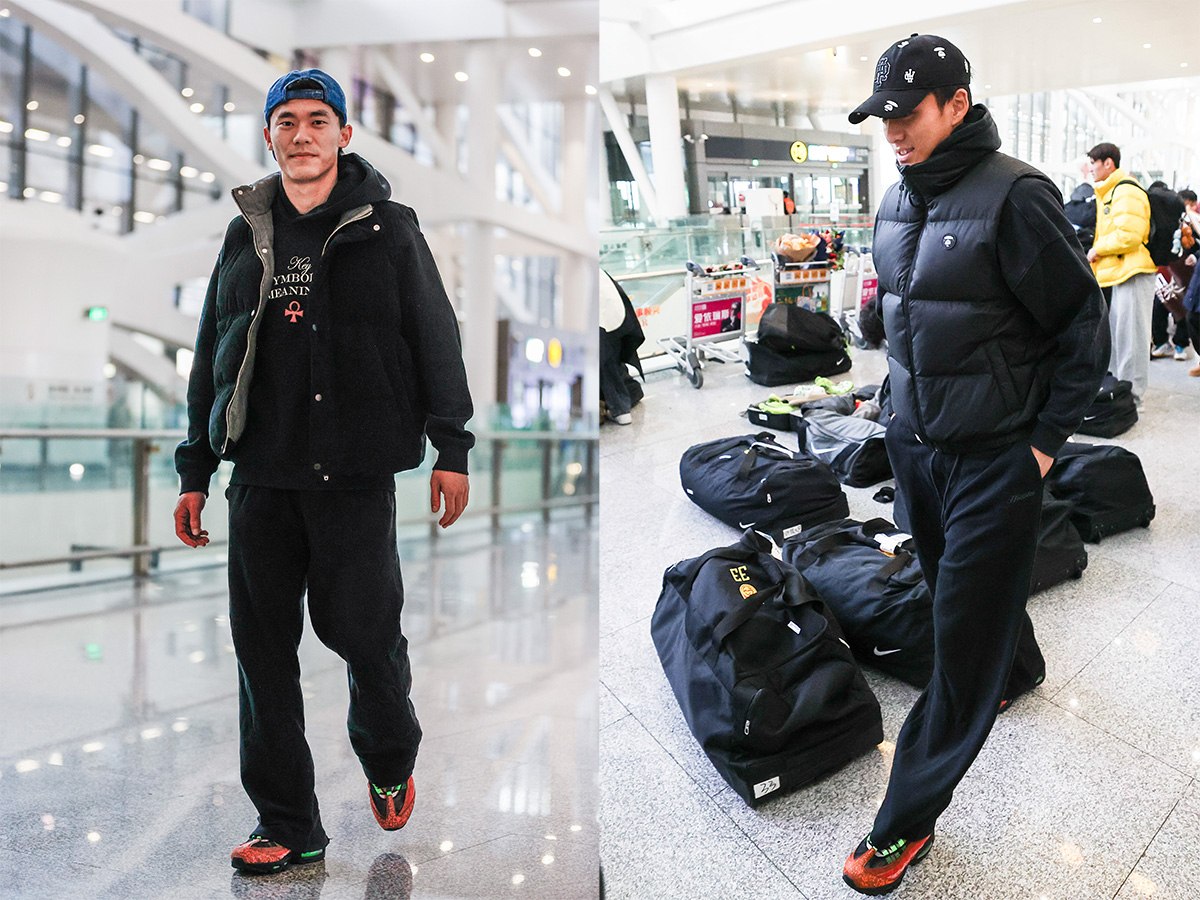 在回京途中,U23 男足队员李昊、胡荷韬率先上脚了全新配色的 Nike Air Max 95。