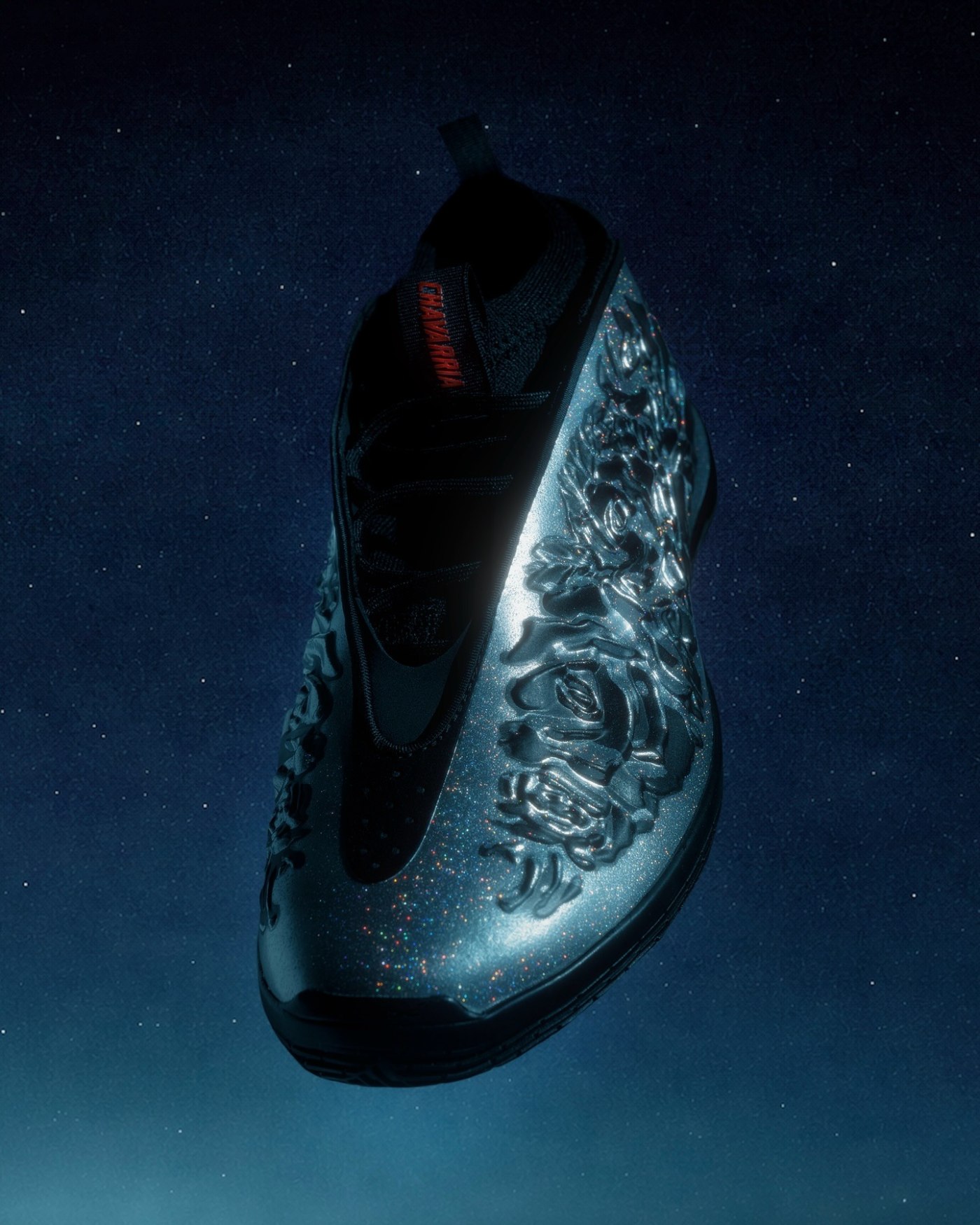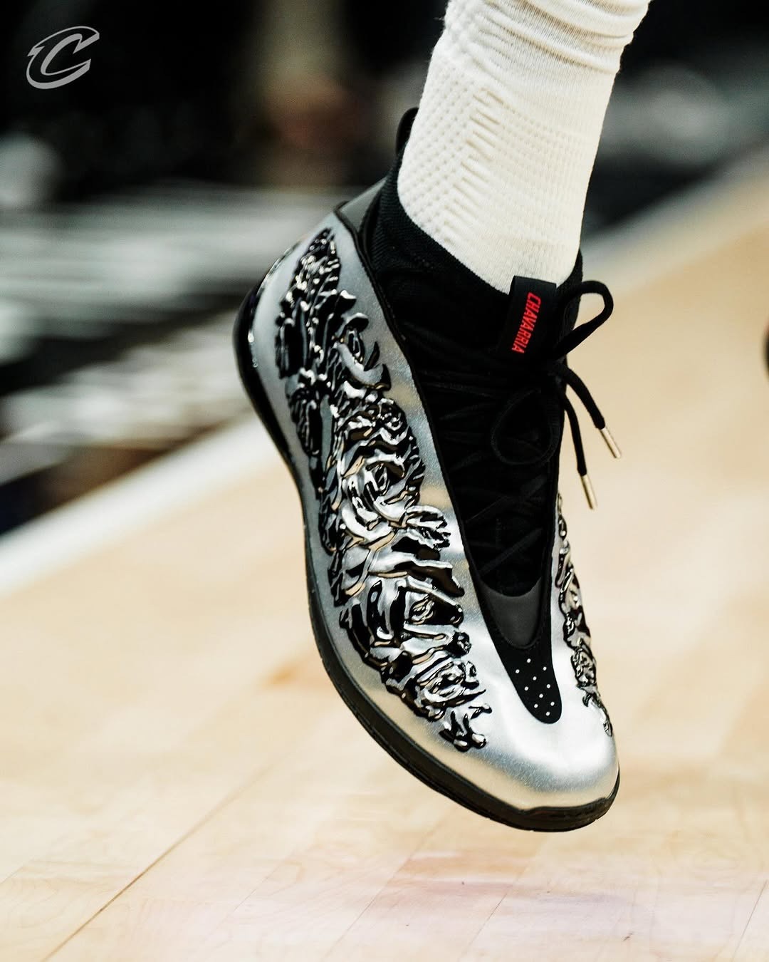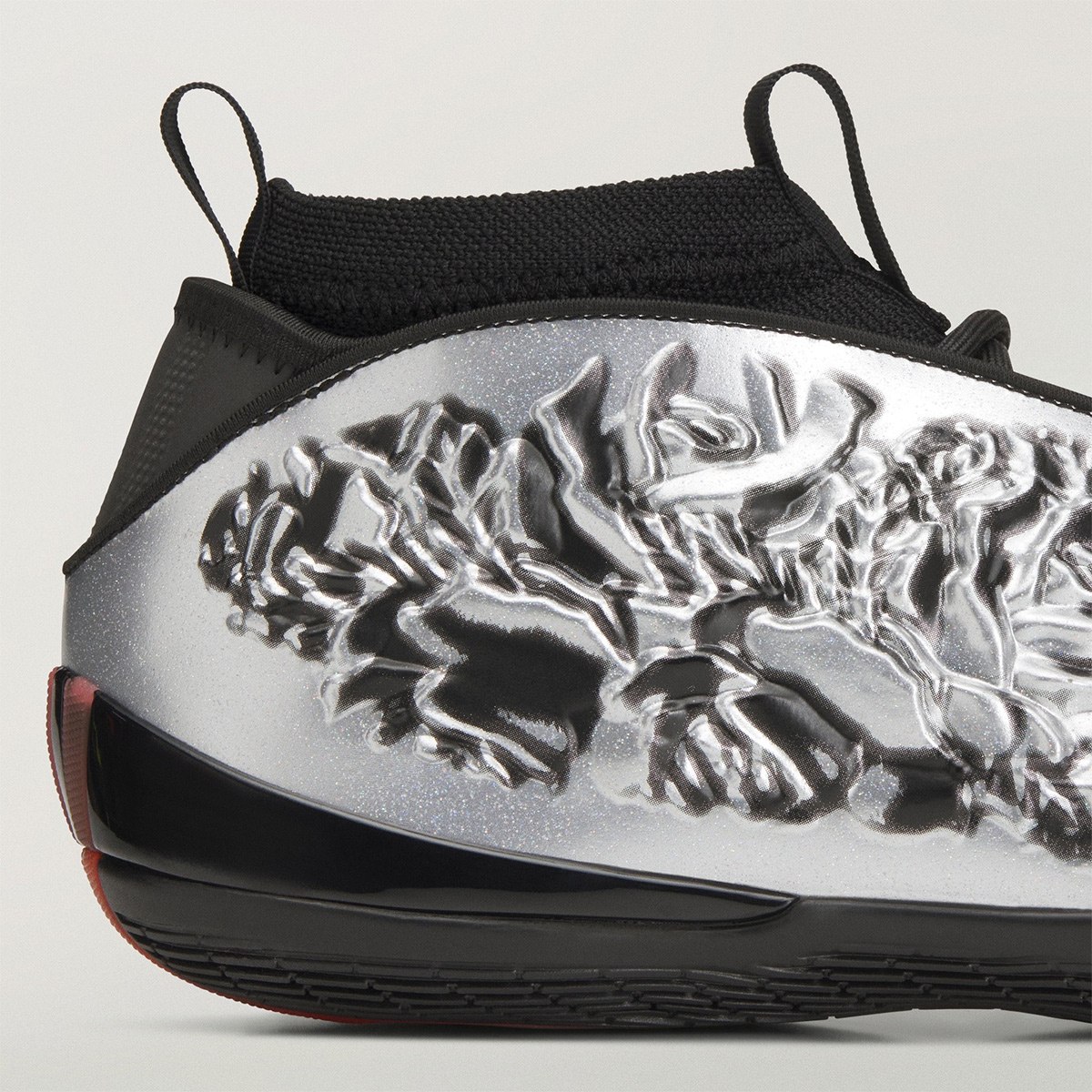 原本的层叠几何结构不见了,取而代之的是包裹鞋身的连续玫瑰压纹,配合银色鞋面,呈现出一种类似液态金属的视觉效果。