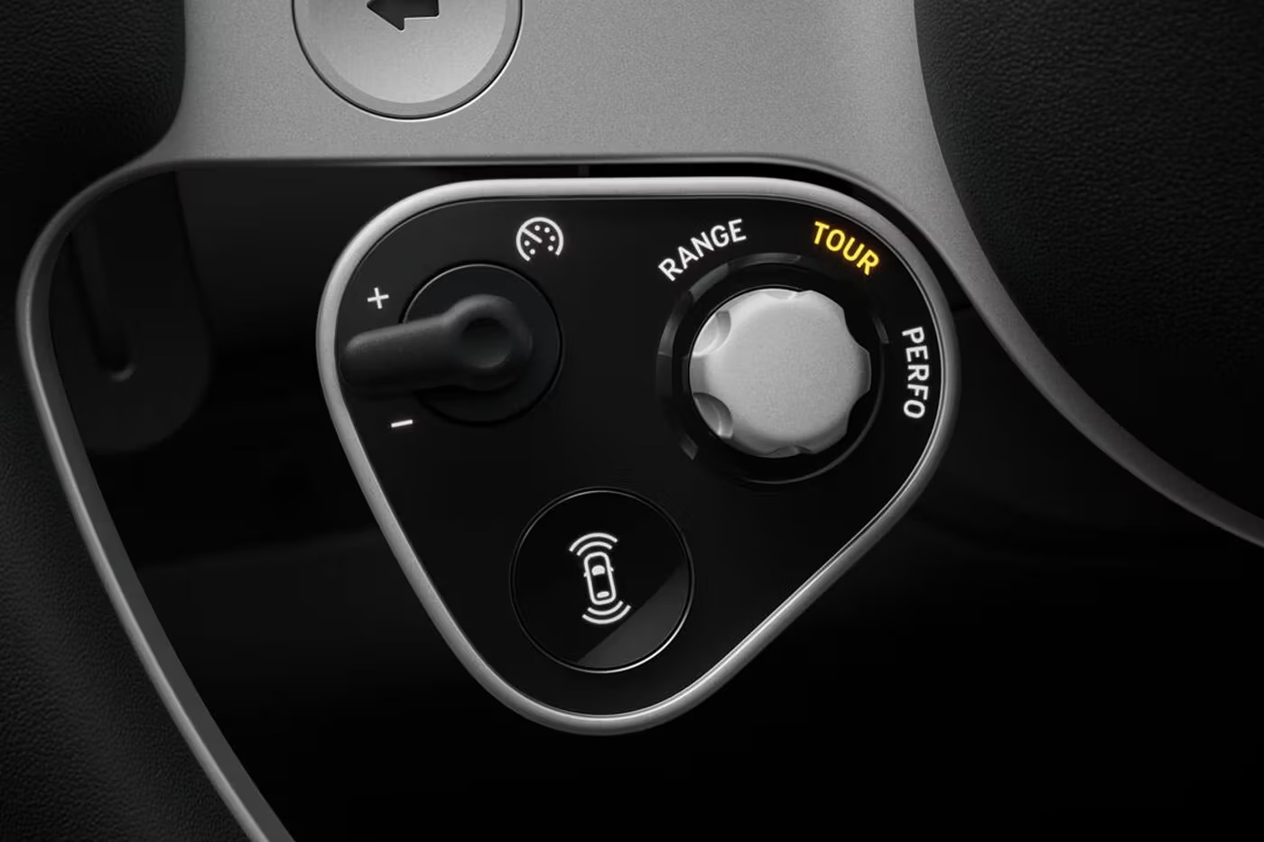 三幅式方向盘完全由回收铝合金打造,不含任何塑料部件,并且摒弃了容易误触的触摸感应,坚持使用实体按键切换驾驶模式。