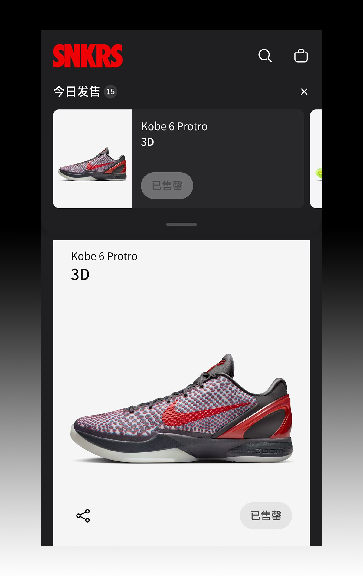 这双 Nike Kobe 6 Protro “3D” 今早登陆国区 SNKRS 发售,发售定价¥1399。