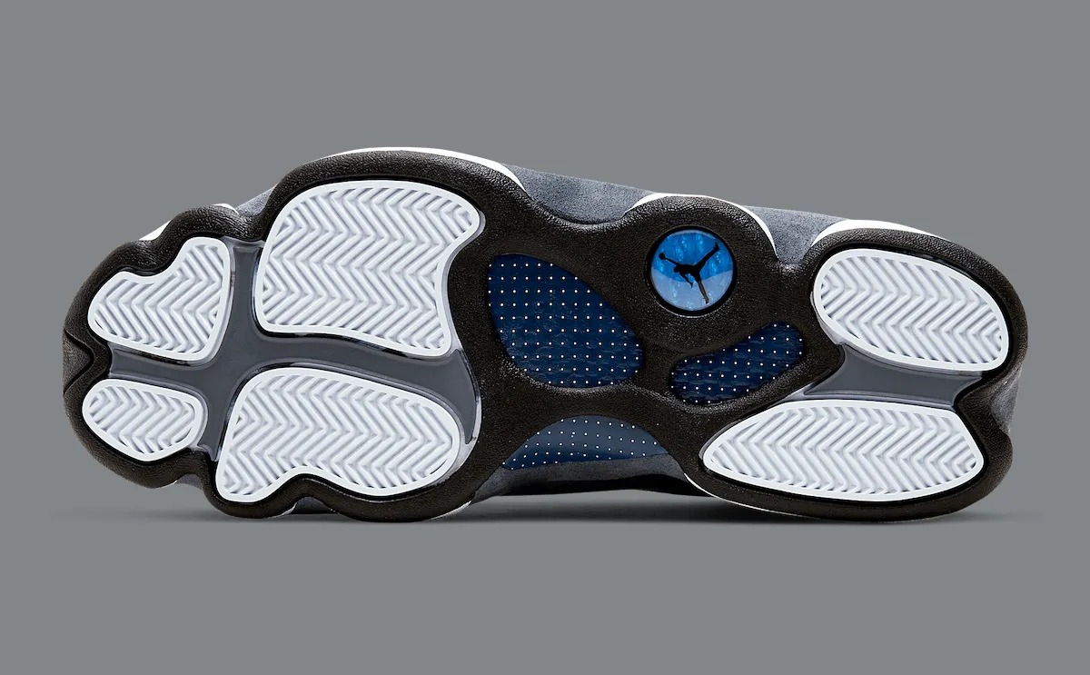 鞋身下部采用燧石灰麂皮,鞋头和鞋舌则是白色皮革,Jumpman Logo 点缀了大学蓝,后跟经典的“猫眼”全息图得以保留。