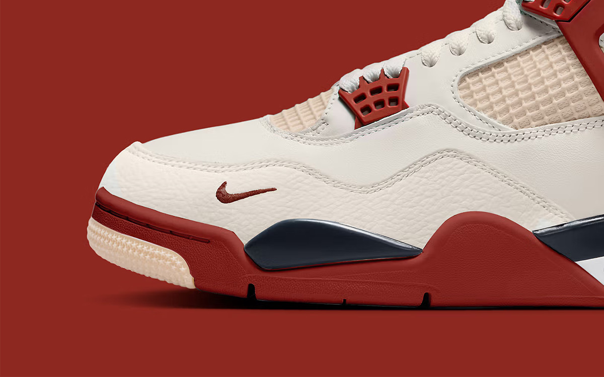整体很有 Air Jordan 4 “Fire Red” 的熟悉气质,但鞋头的小 Swoosh 相当显眼,彰显了它的联名身份,乔丹甚至还将吊牌保留。