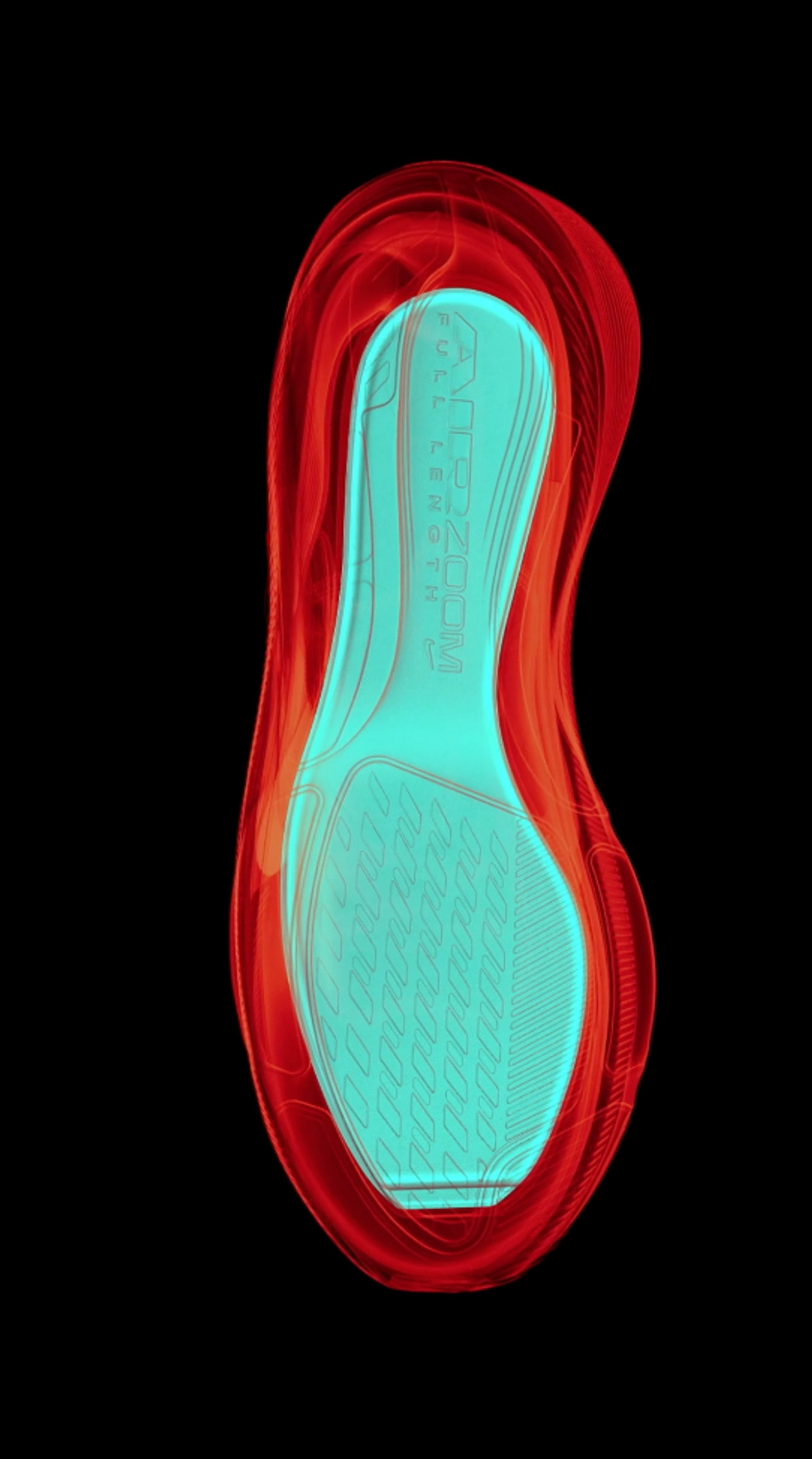 通过官方的分解图,我们可以看到在 ReactX 泡棉中底之上,采用了曲线型的全掌尺寸 Air Zoom 气垫。