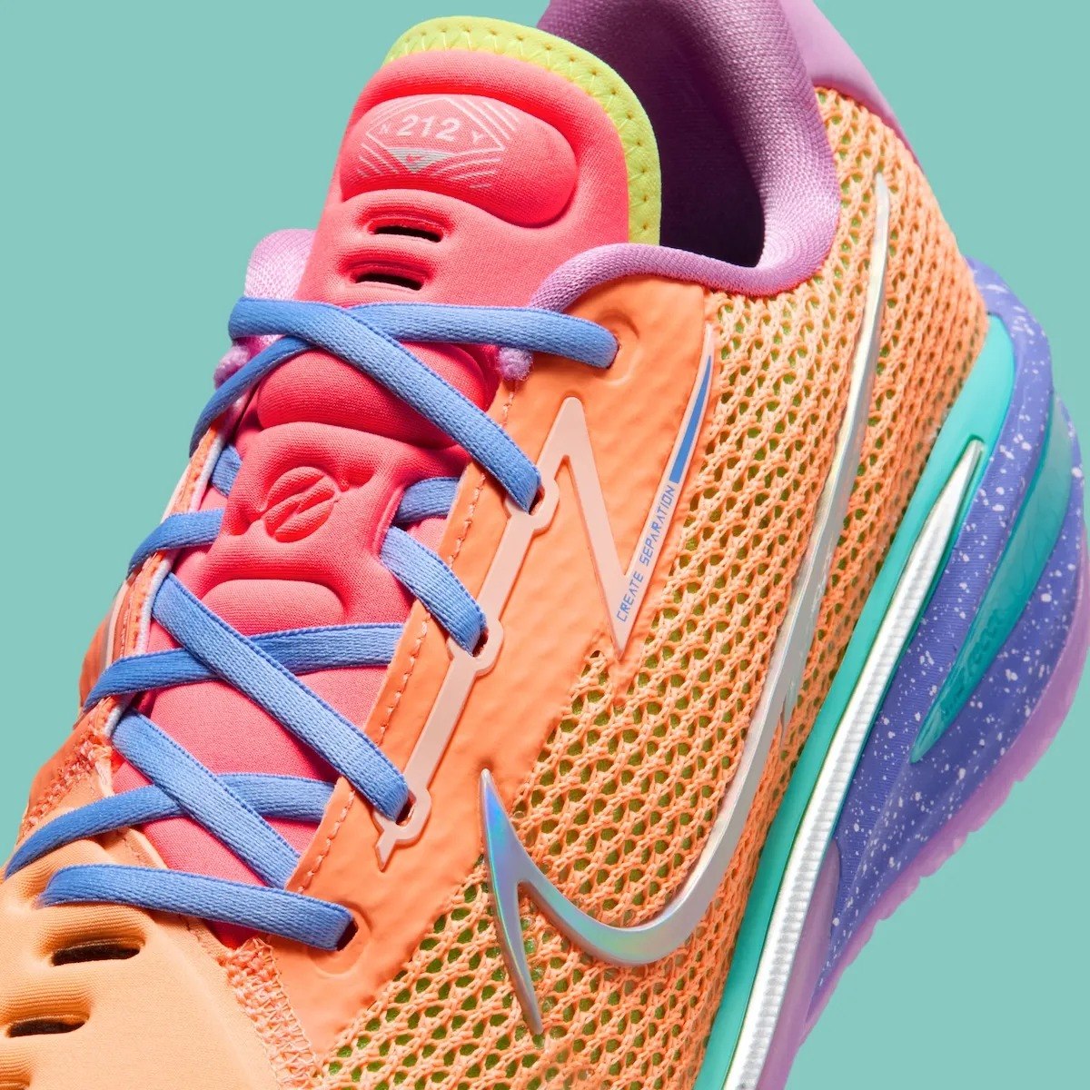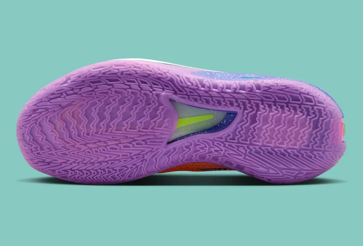 配色方面,整双鞋以橙色为主调,搭配紫色细节点缀。中底采用蓝色泼墨设计,加上荧光装饰和炫彩元素,视觉冲击力十足但不失克制,在张扬与实战功能之间找到了平衡。