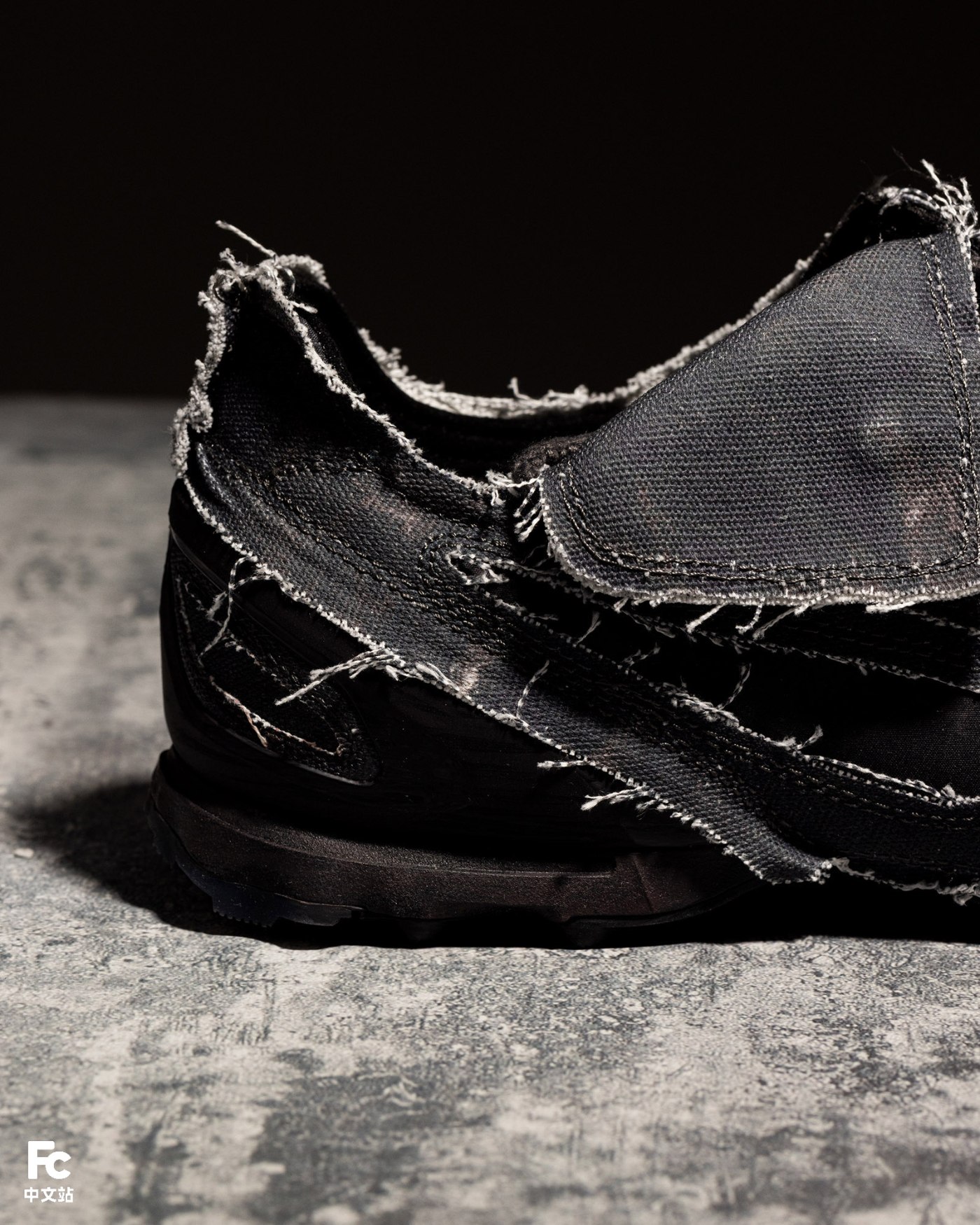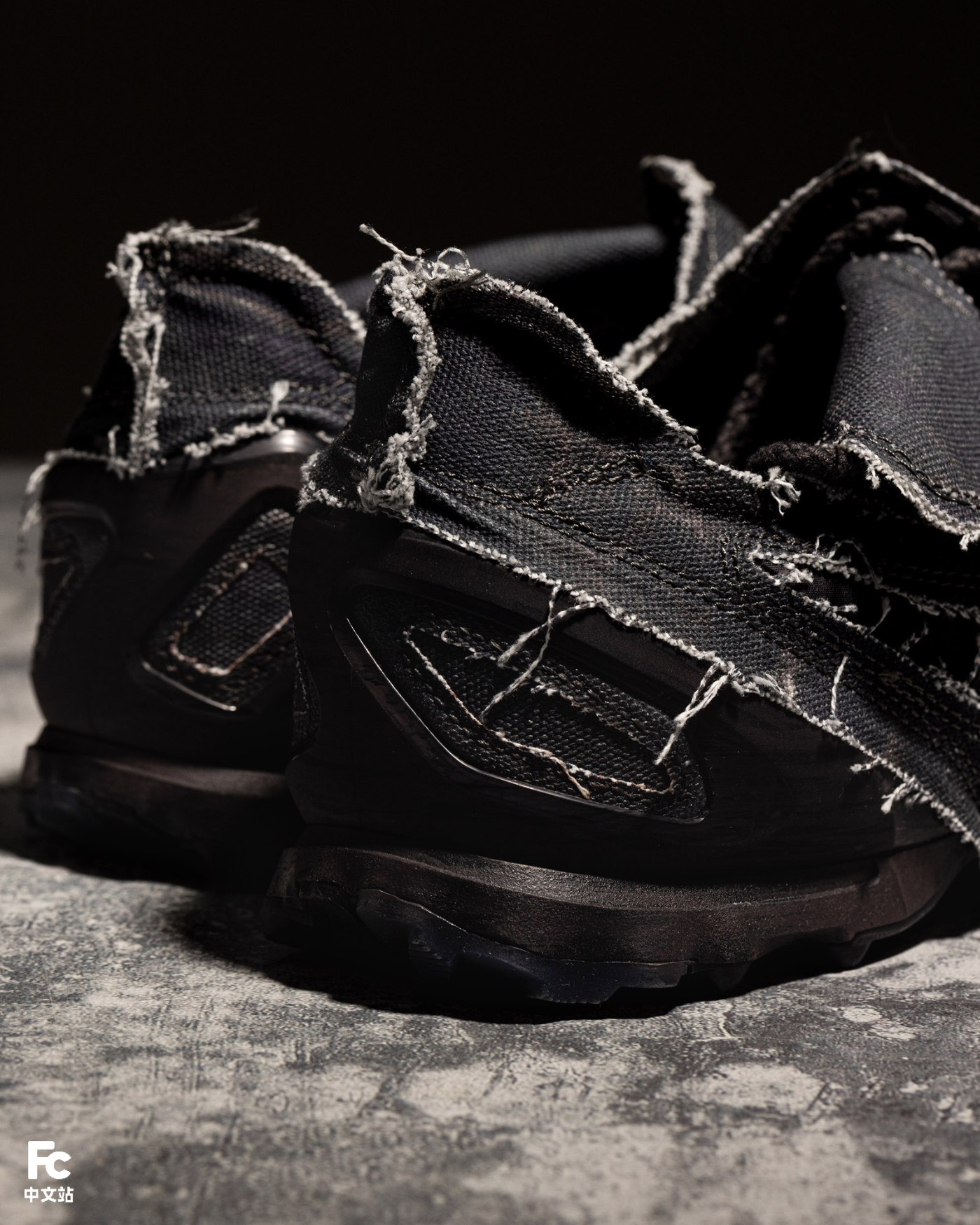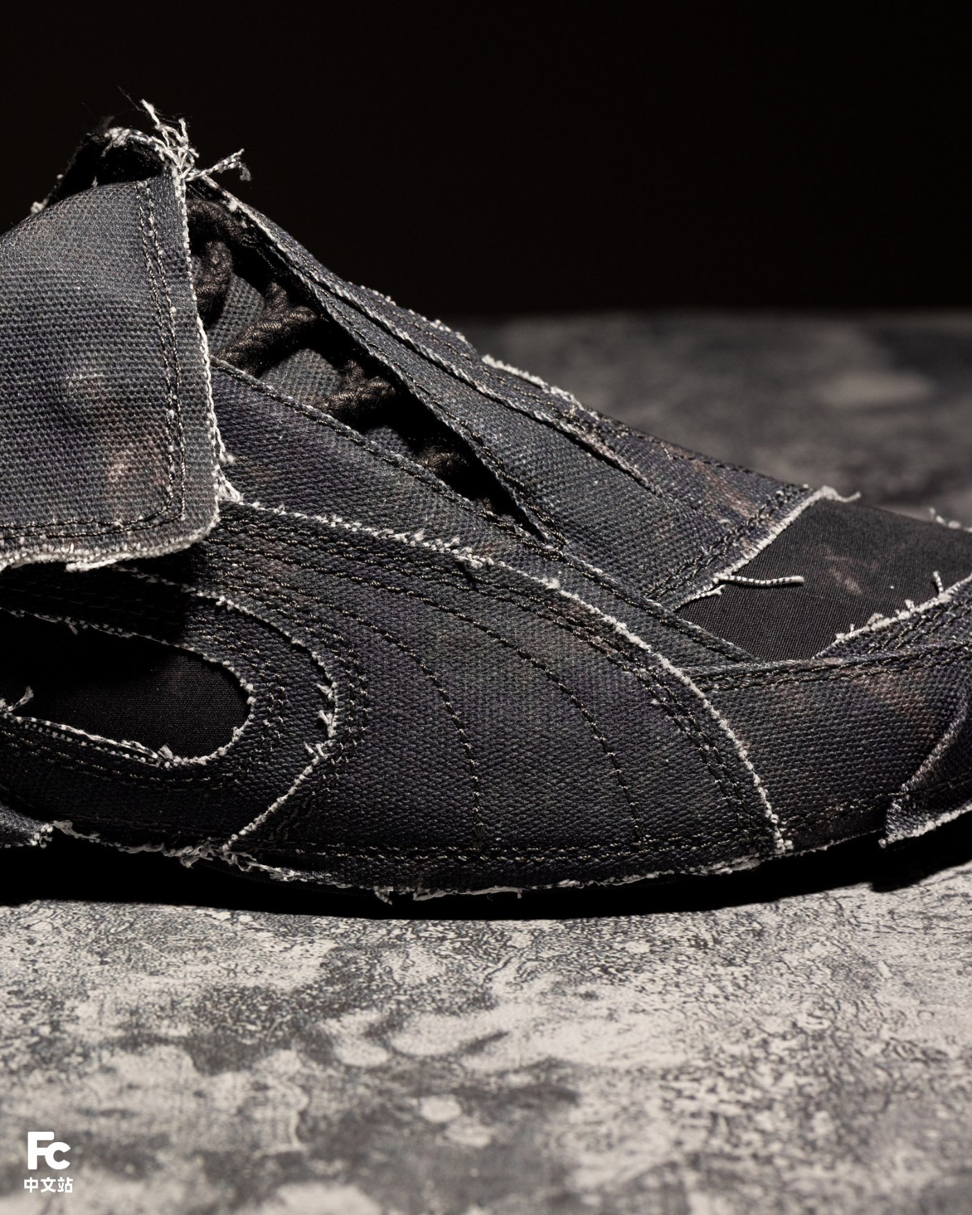 鞋面采用帆布材质,搭配外露缝线和未经修饰的边缘处理,强调粗粝的质感表达。