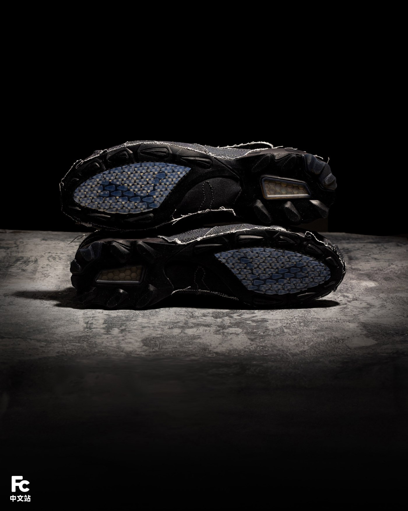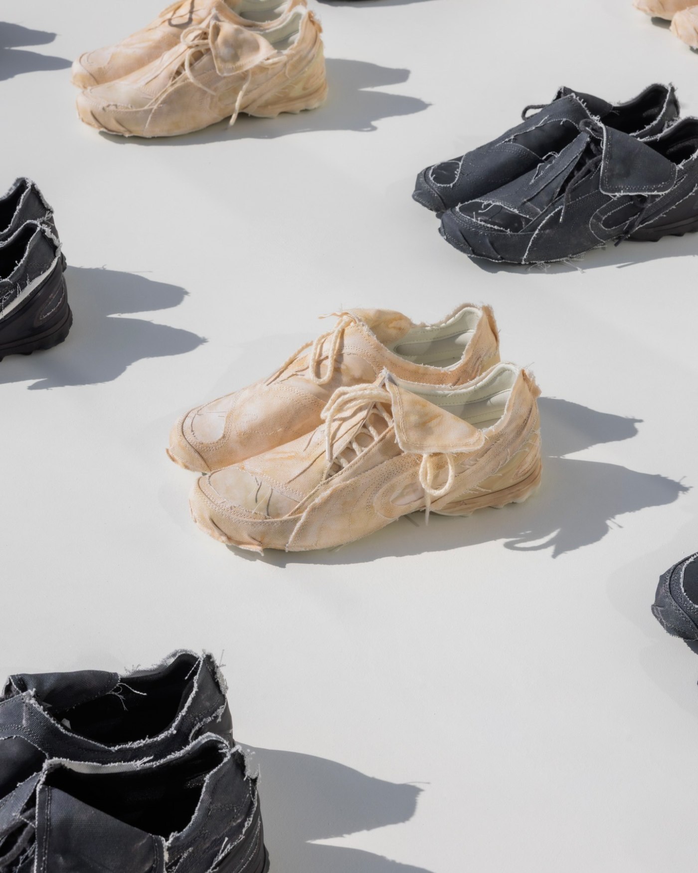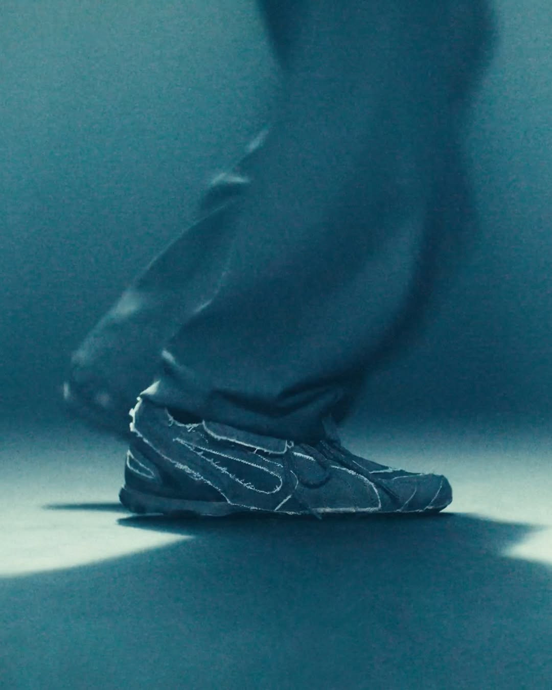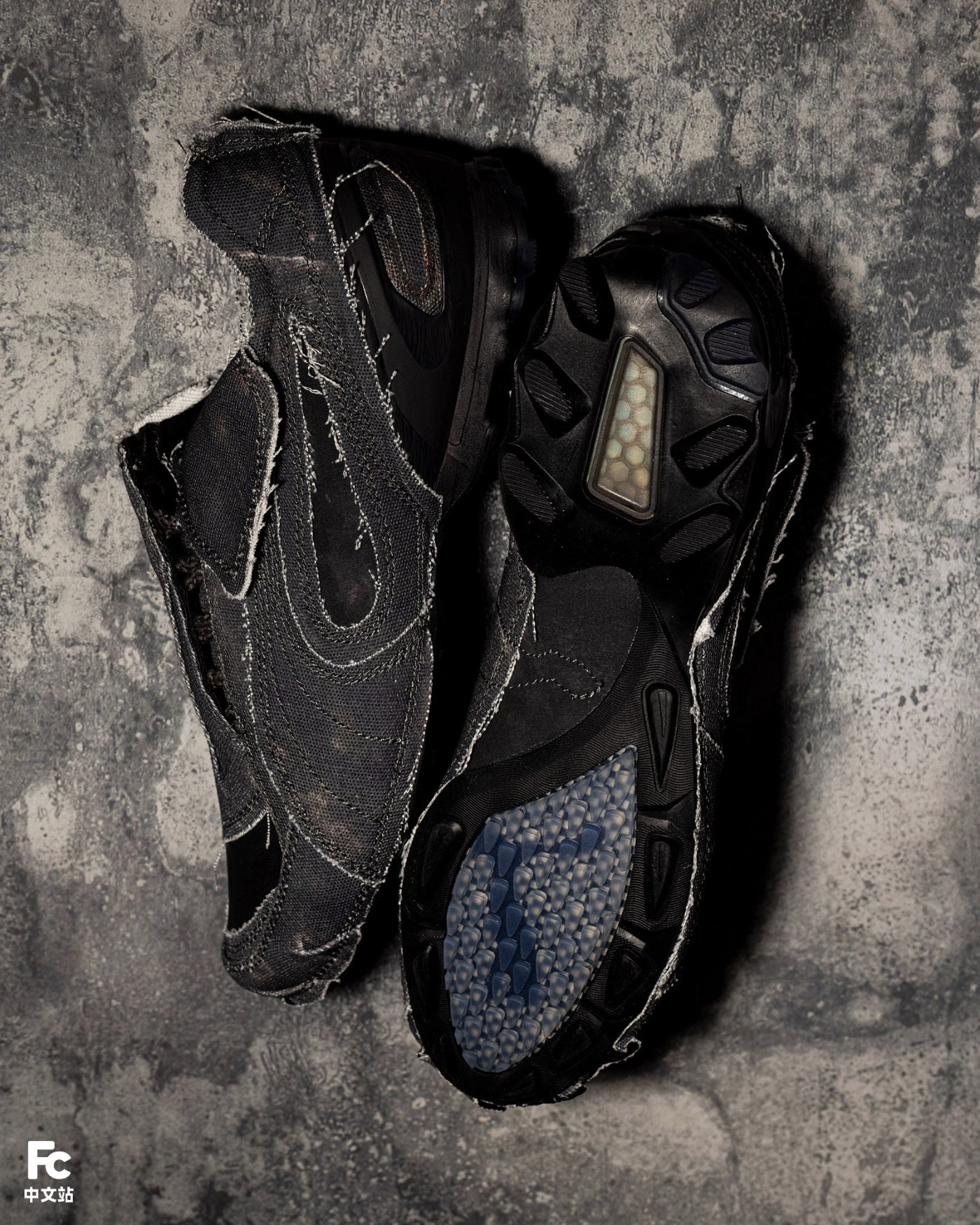鞋面采用帆布材质,搭配外露缝线和未经修饰的边缘处理,强调粗粝的质感表达。