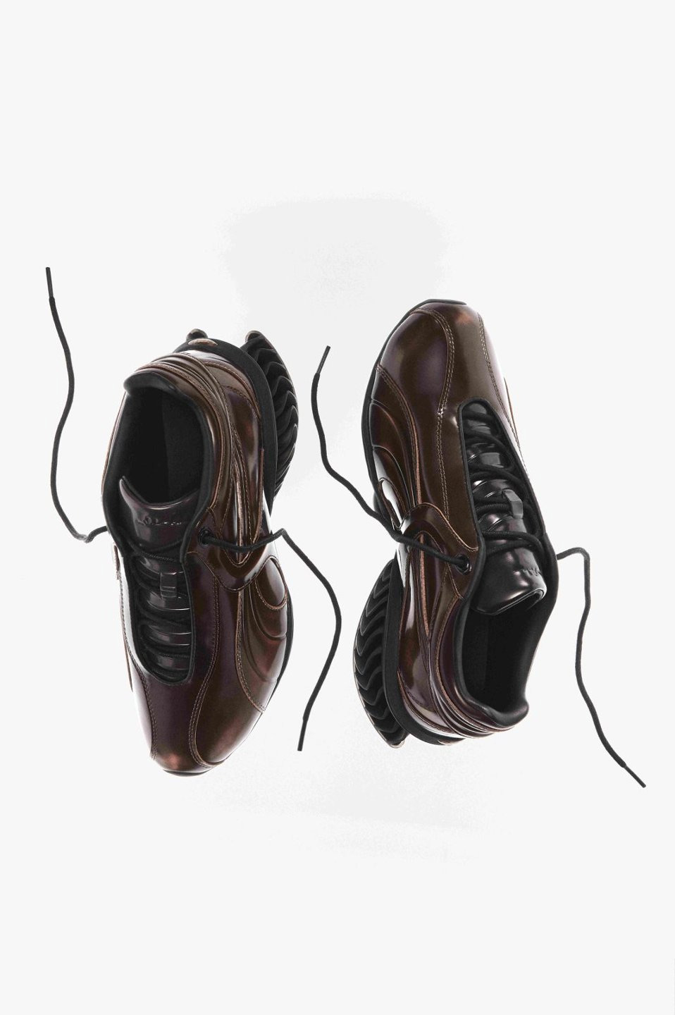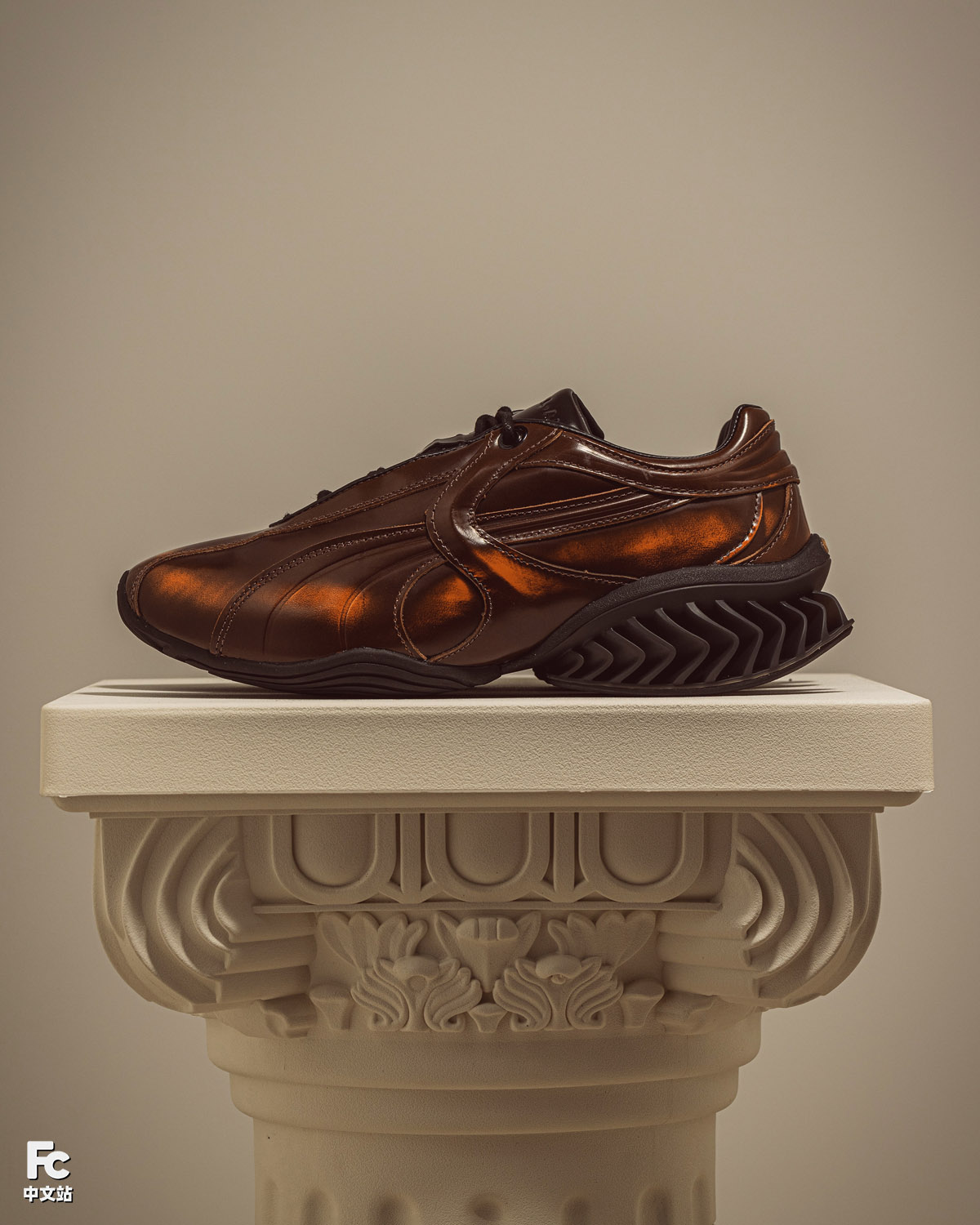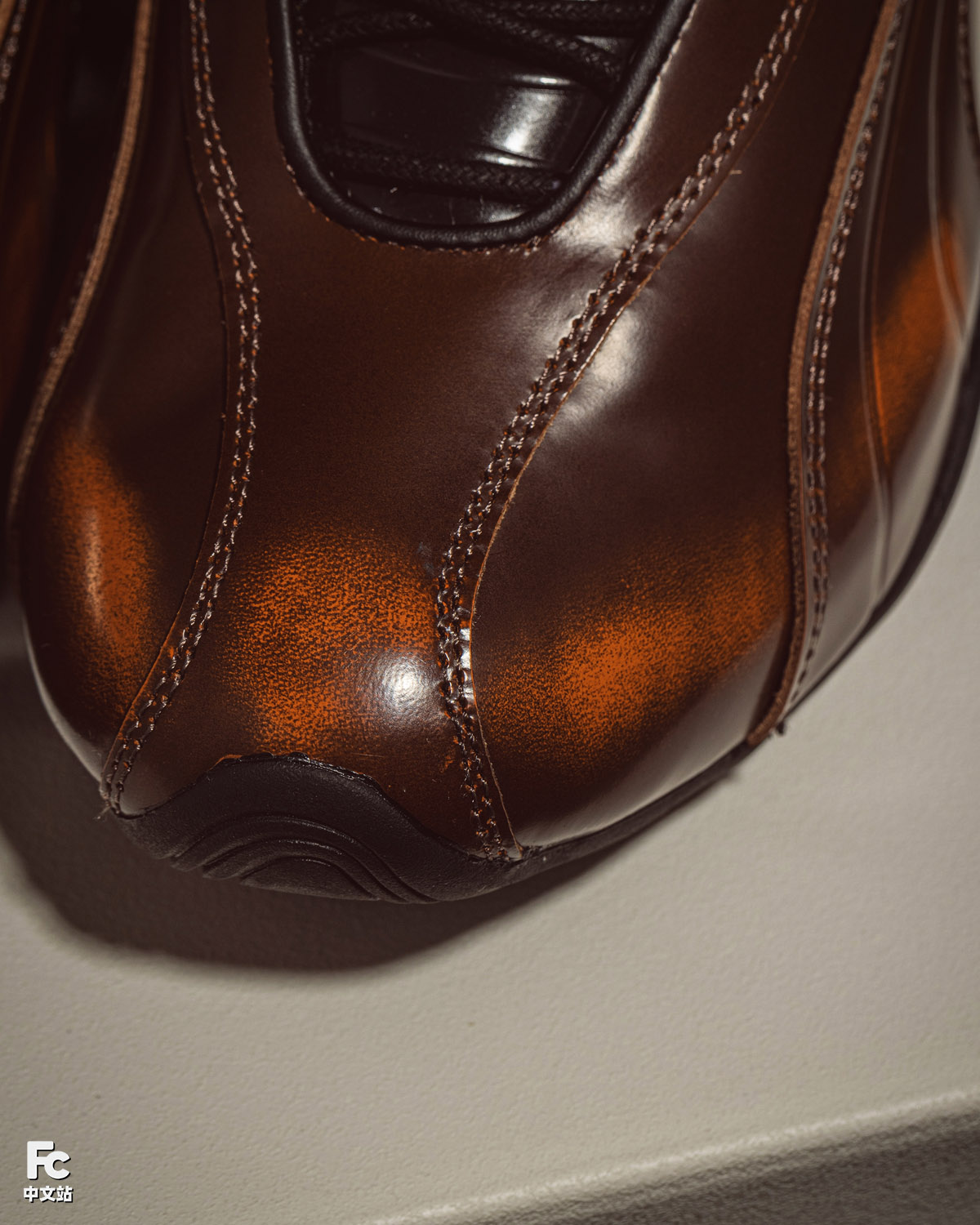 鞋身主要由经过特殊处理的漆皮打造,带有随时间流逝而变淡的做旧效果。