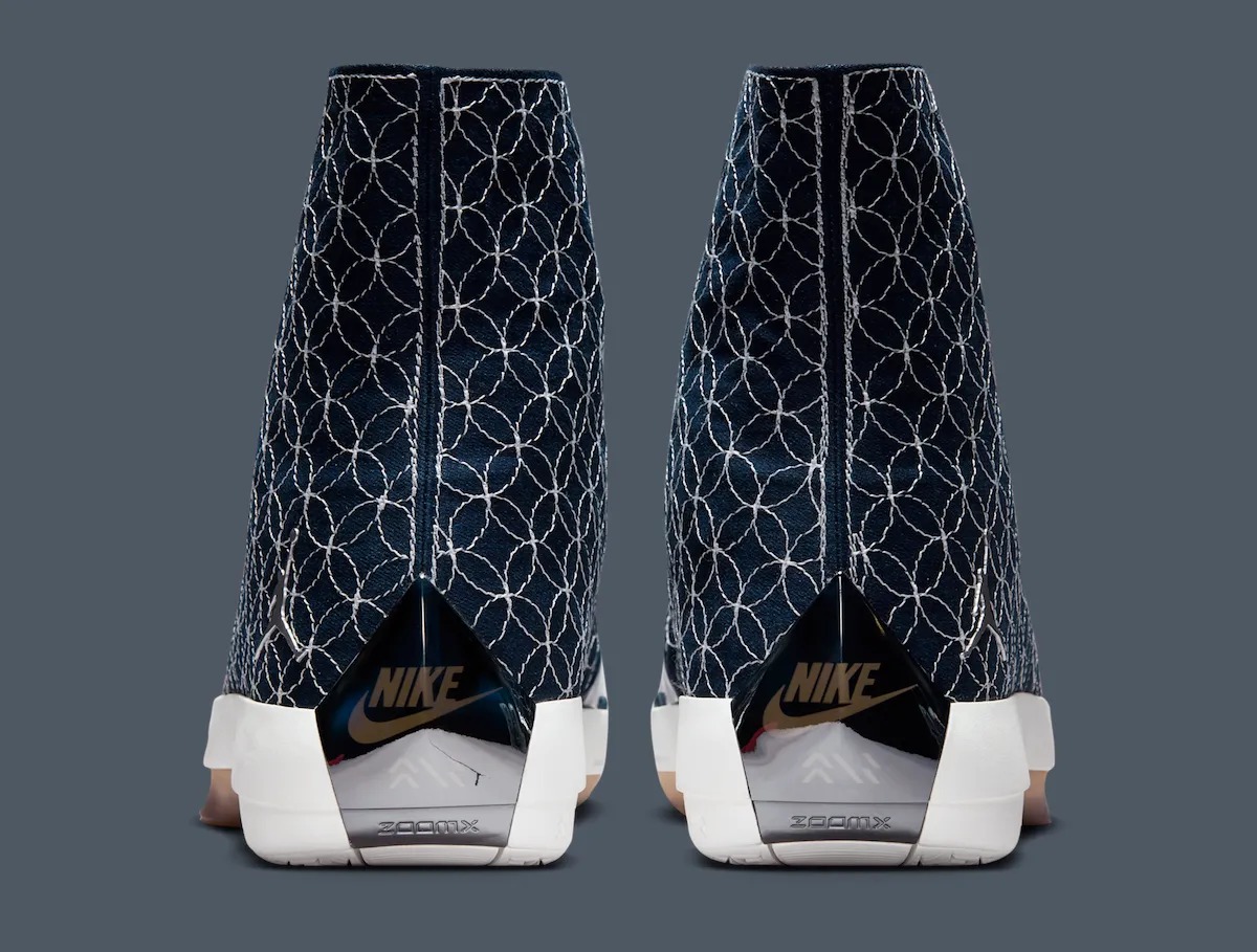 表面布满了传统的日式刺子绣缝线,丰富了纹理质感。中央的拉链设计让鞋身更加简洁,搭配亮面的挡泥板,带来了材质上的对比。