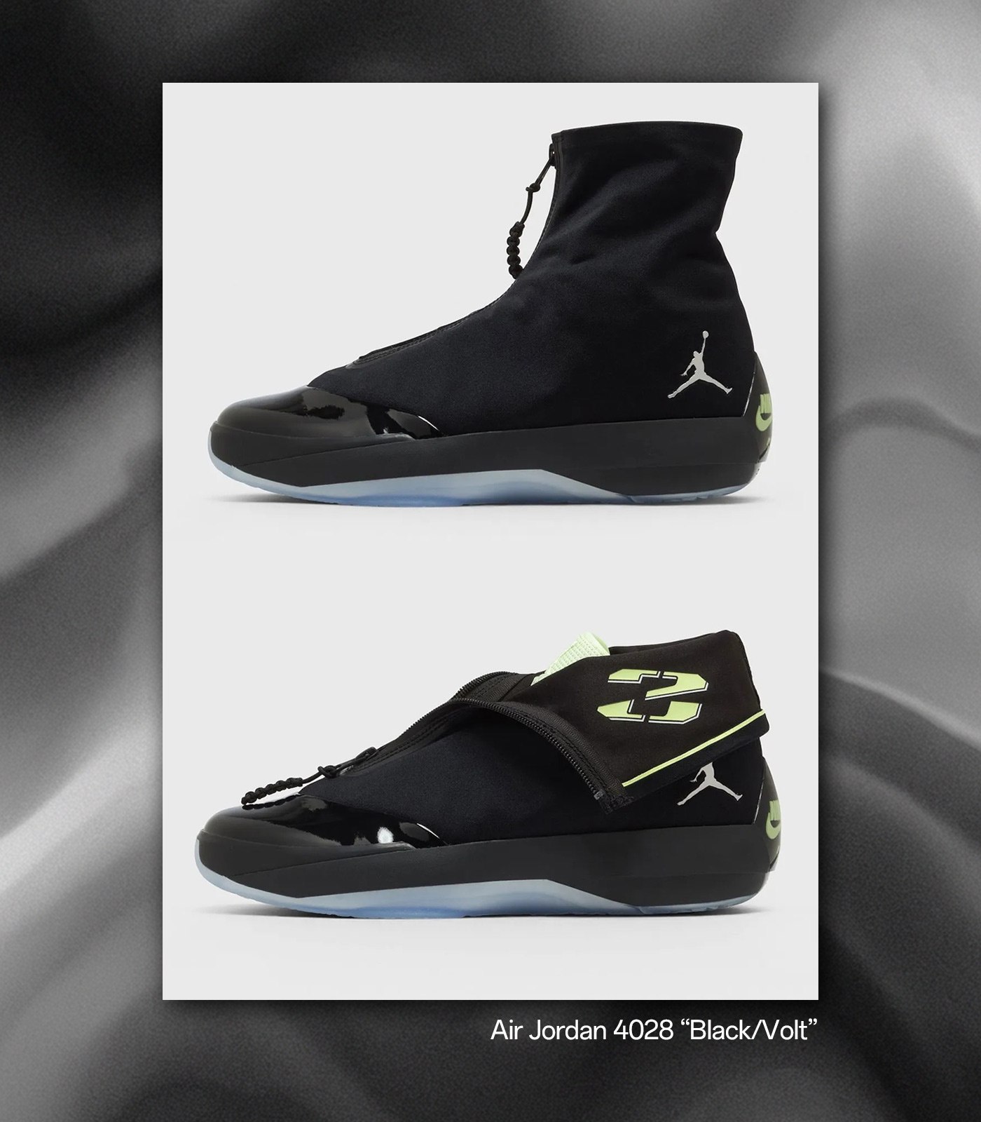 Air Jordan 4028 借鉴了 Air Jordan XX8 的设计语言,最具辨识度的便是翻折式鞋套设计,整体造型有着类似靴子的流畅感,不仅在当年,哪怕现在也是极为独特的存在。