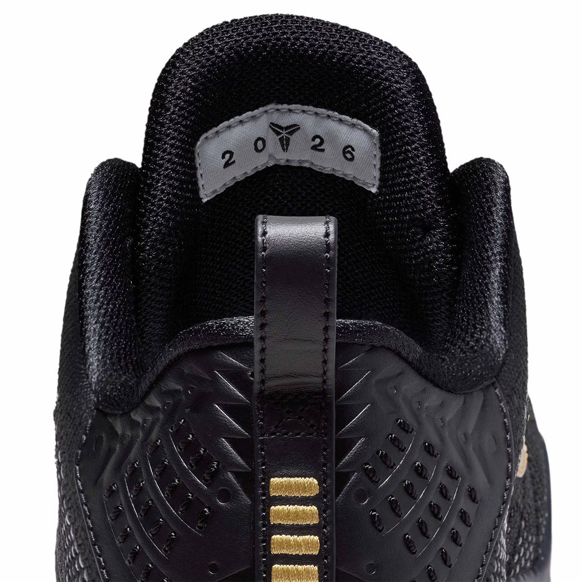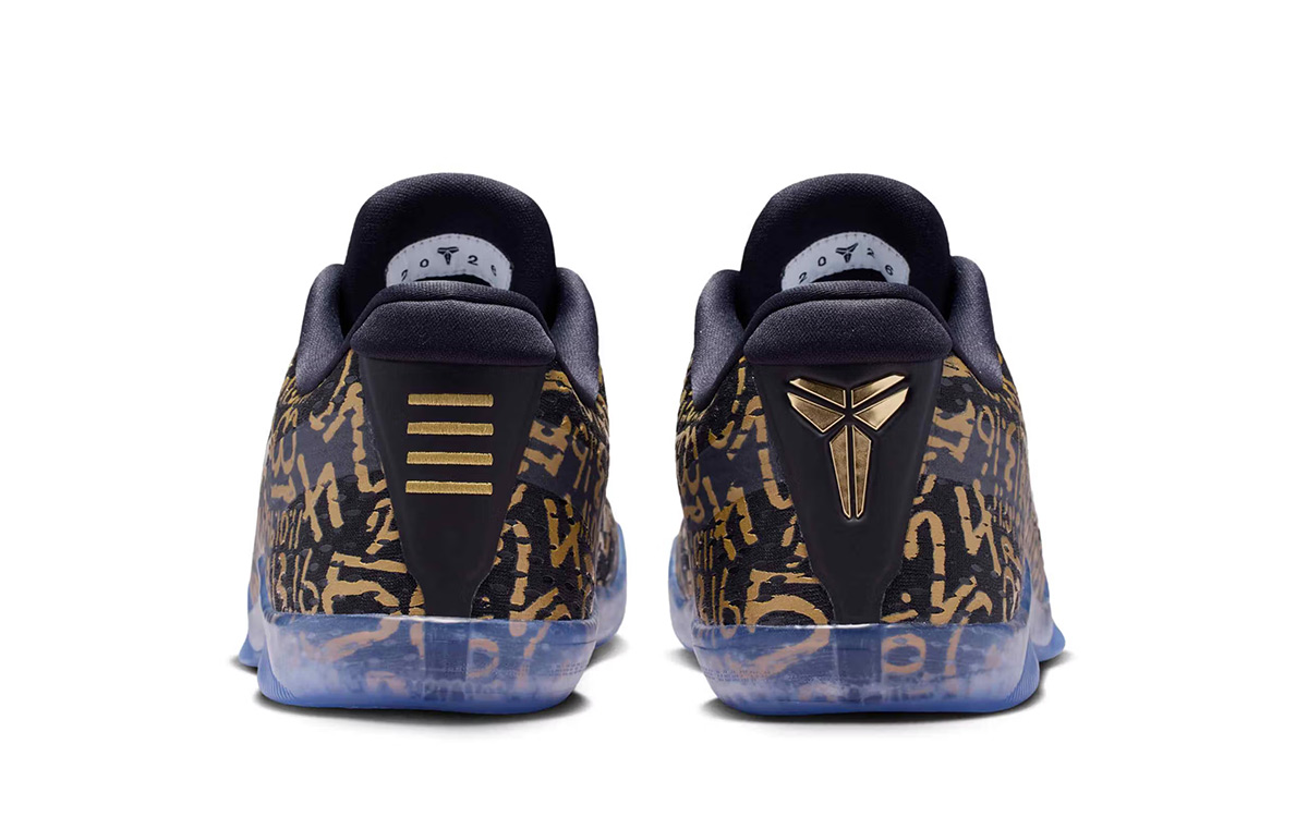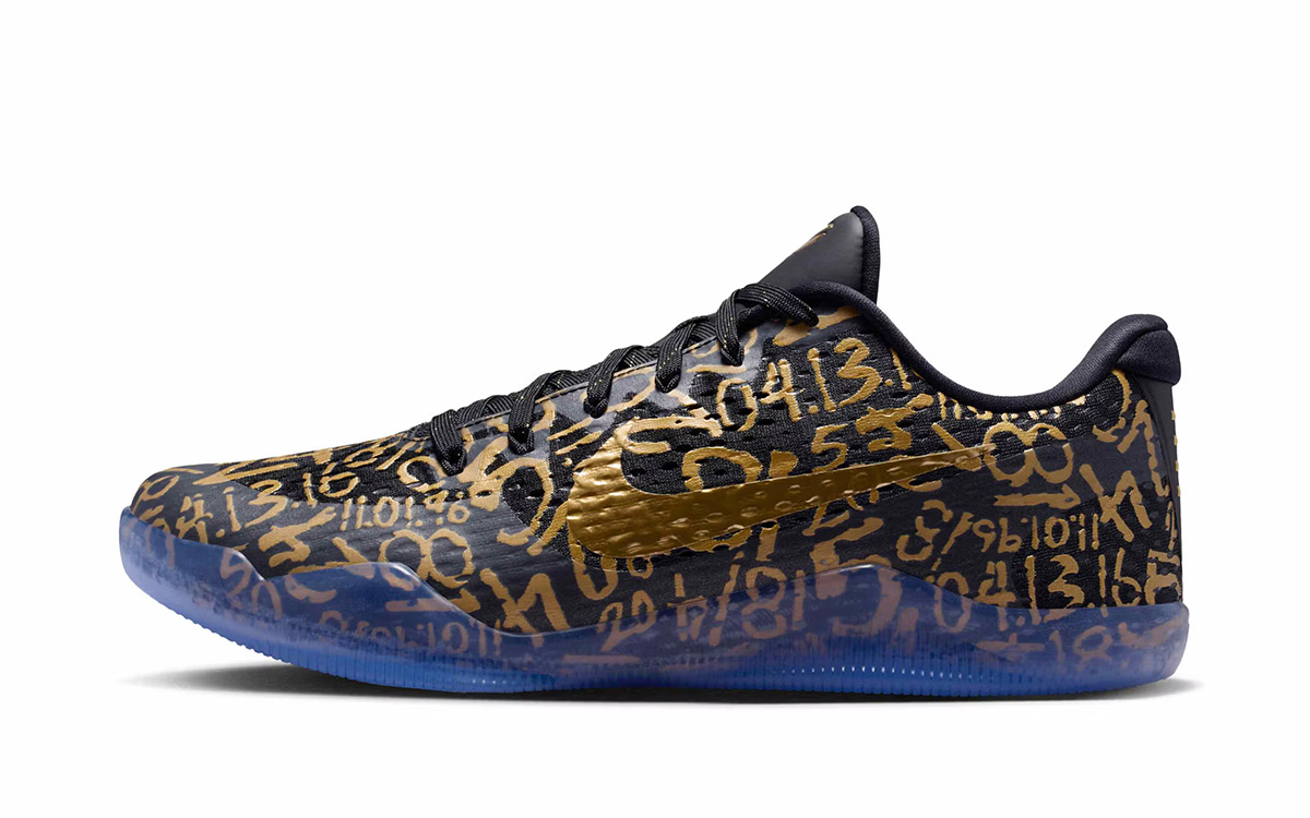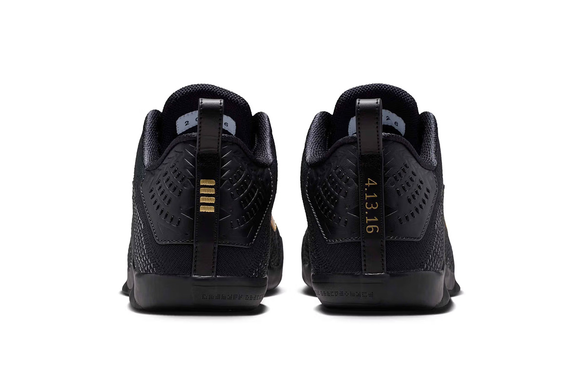 这双 Kobe 11 EM 也有着浓厚的致敬科比氛围,黑色基调之下,以金色呈现了诸多关于科比职业生涯的数字。