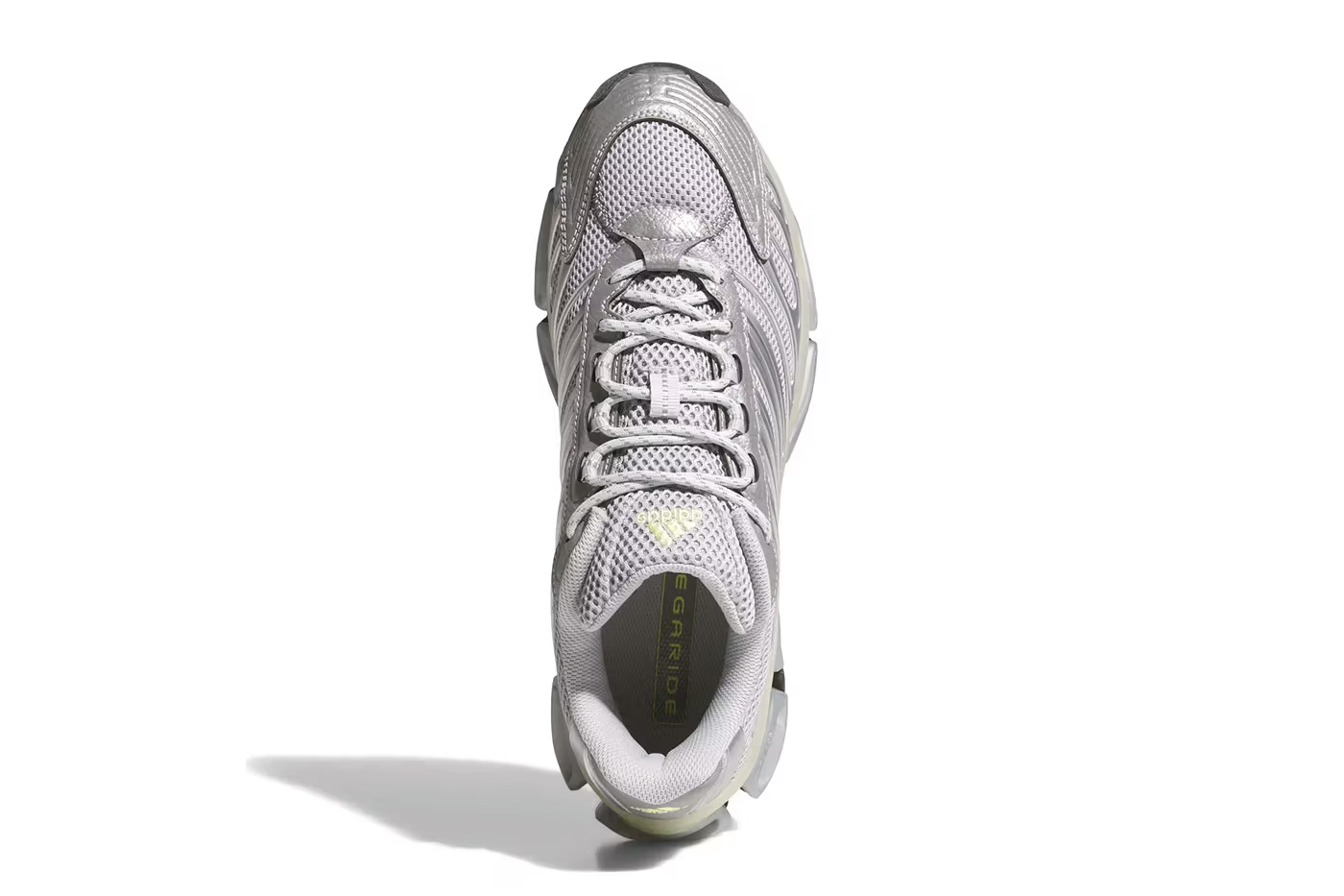 这双 adidas Megaride AG "Silver Metallic" 带来十足的未来科技气质,首先是极富辨识度的鞋底结构,再现了结构缓震时期那夸张的视觉冲击力。