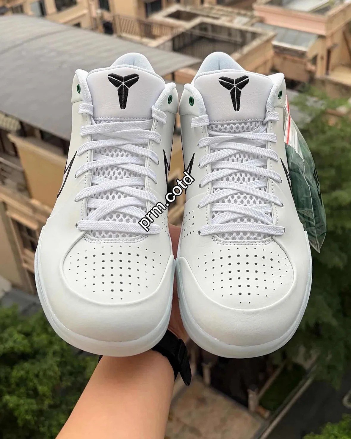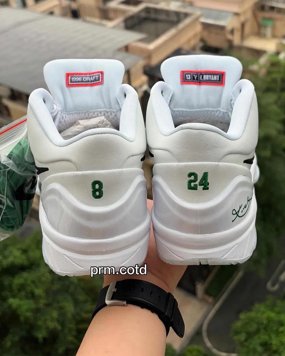 这双 Nike Kobe 4 Protro “Boston Celtics” 同样是清爽的白色打底,点缀绿色细节和黑色 Swoosh。