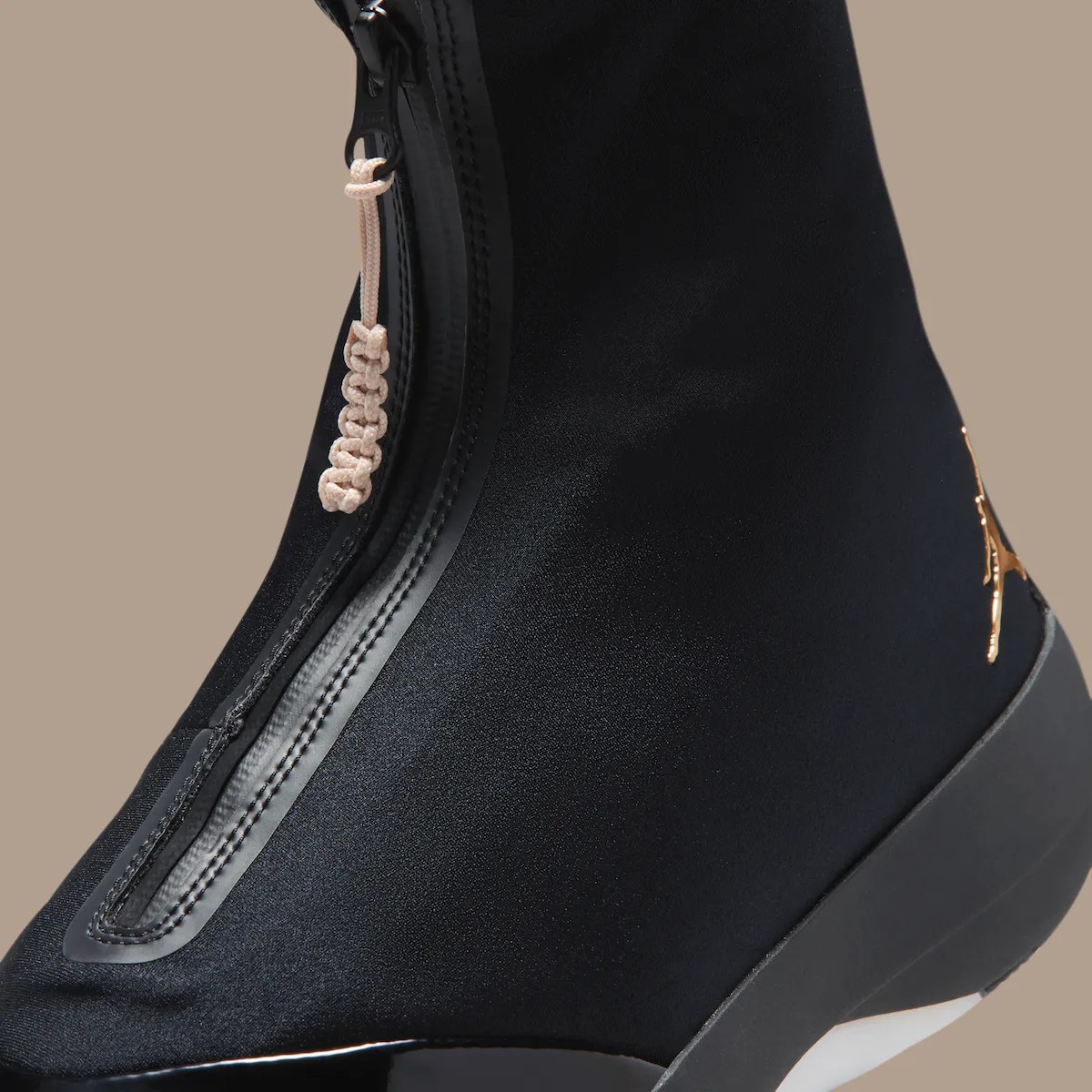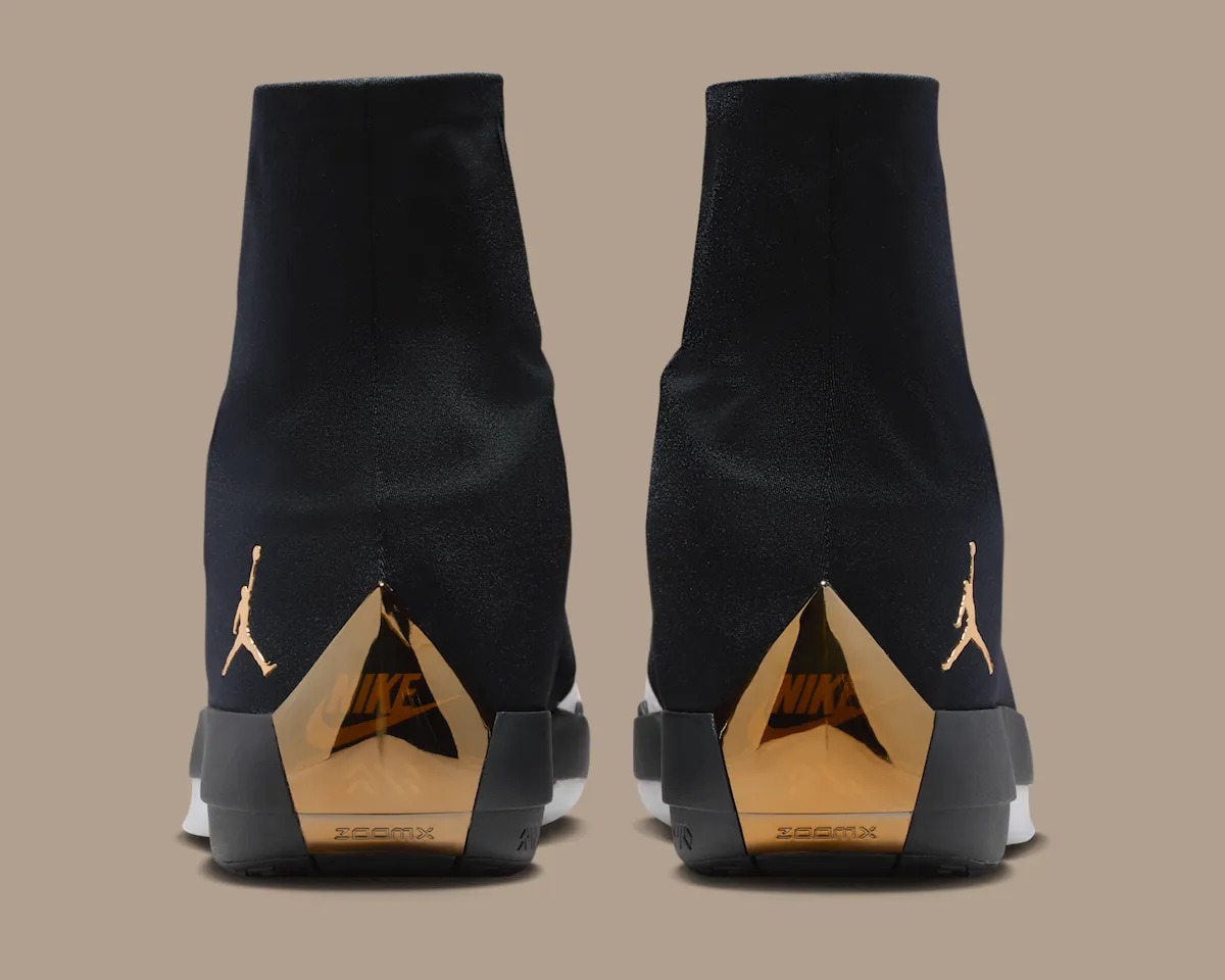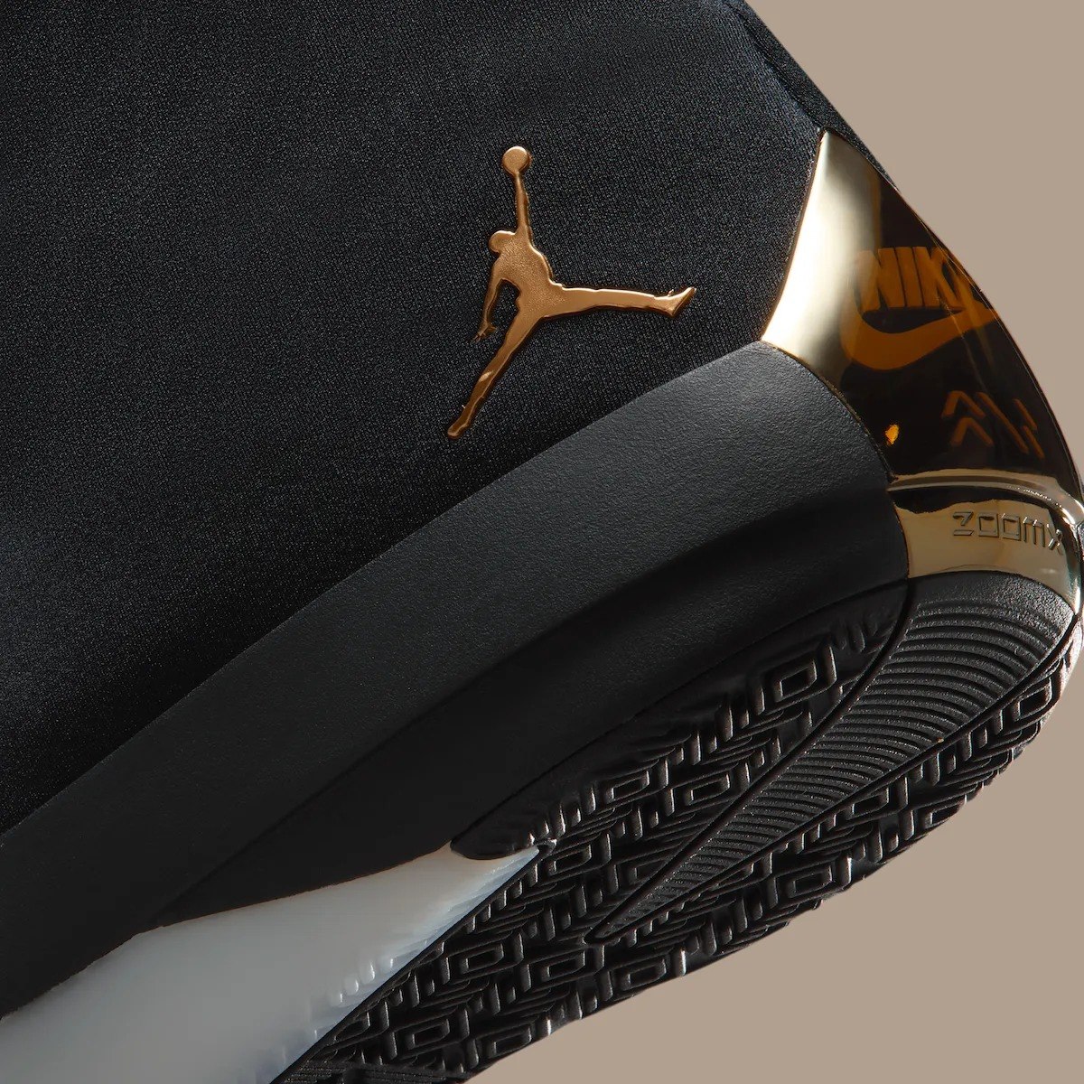 无论是外侧后跟的飞人标志、隐藏的鞋舌标识,还是翻盖底下的 “23” 字样,都通过金色彰显出独特的质感。