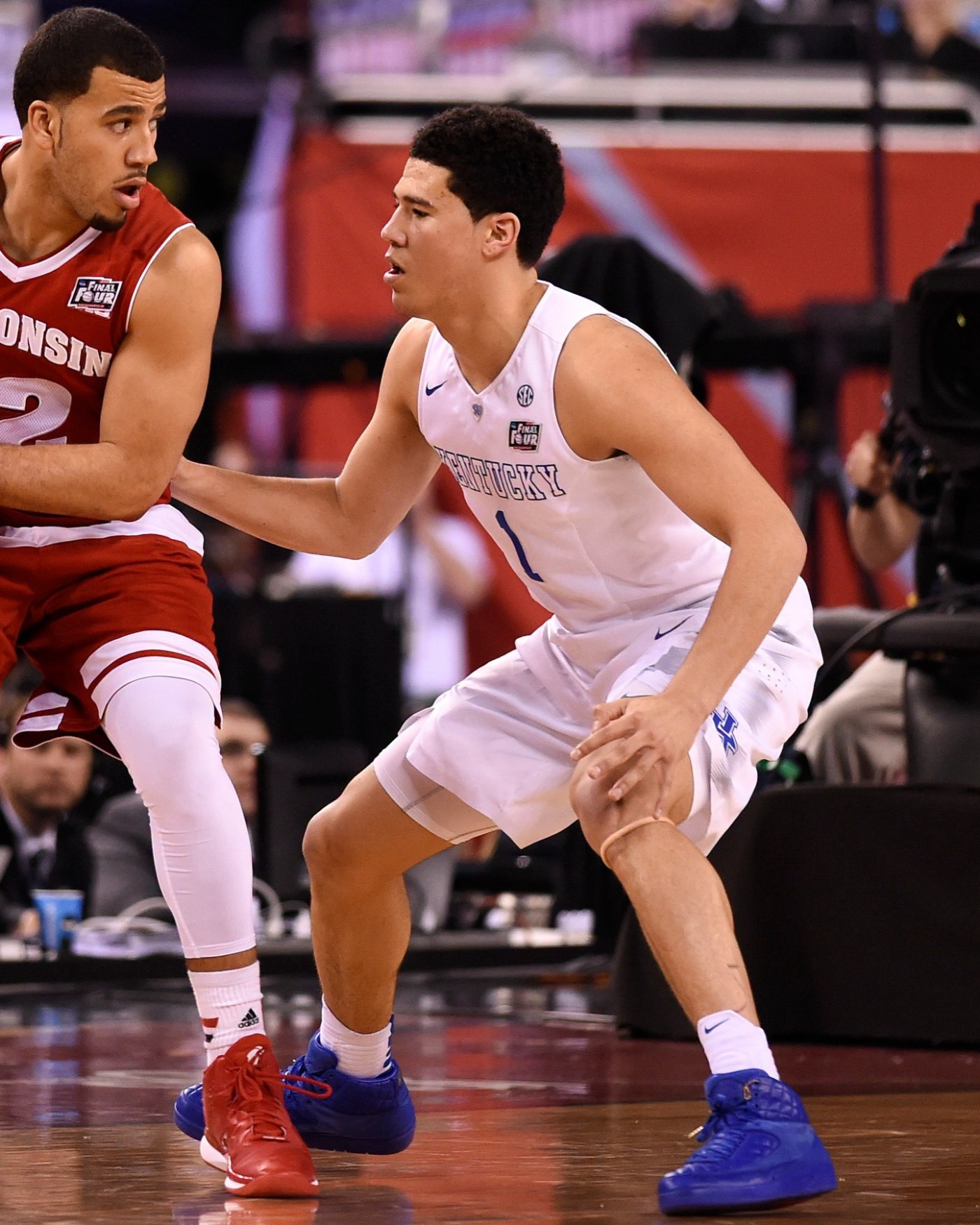 布克当年在 NCAA 时期身披肯塔基大学战袍,他曾经在赛场上上脚过这双蓝色的 Just Don x Air Jordan 2。