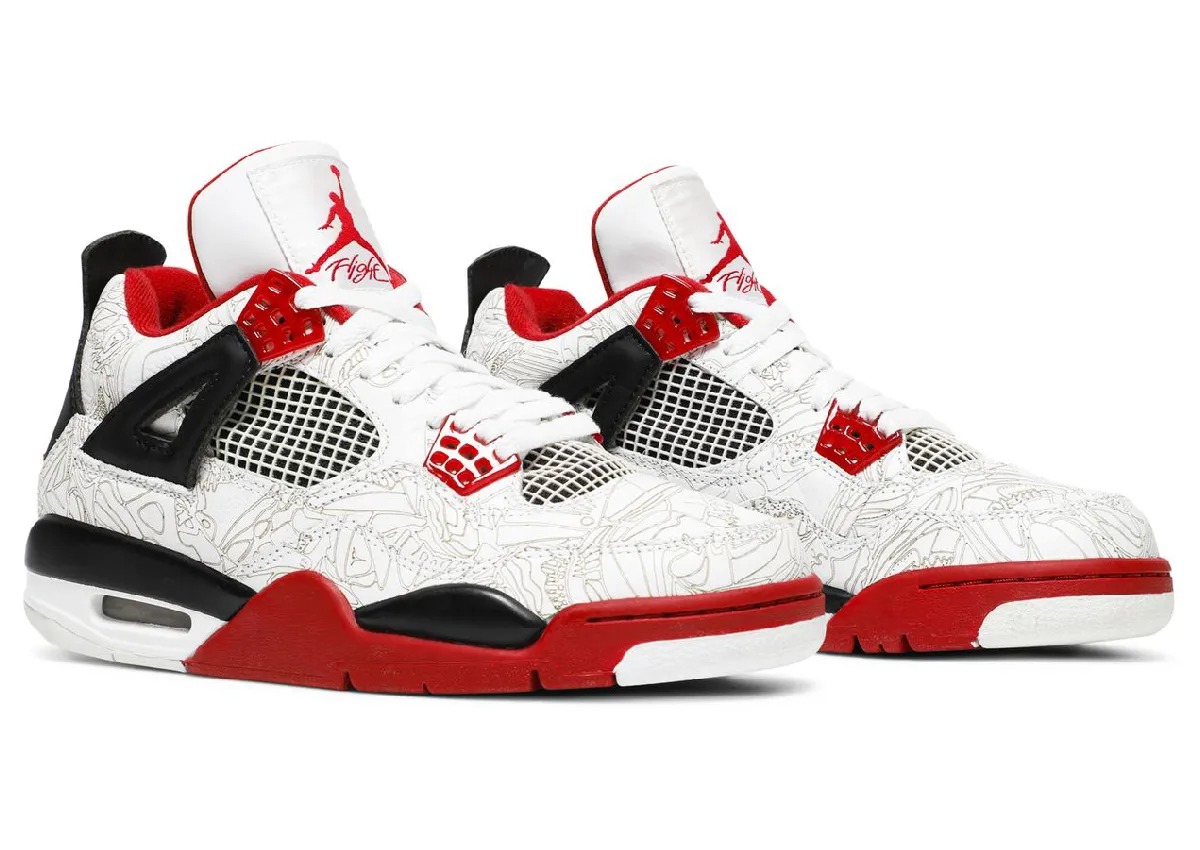 这双鞋基于经典的 Fire Red 白红配色方案,在皮革鞋面上使用激光镭射技术,呈现了在当时极为惊艳的视觉效果。
