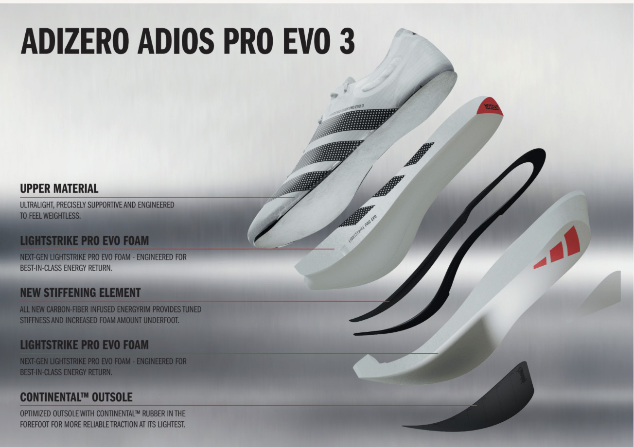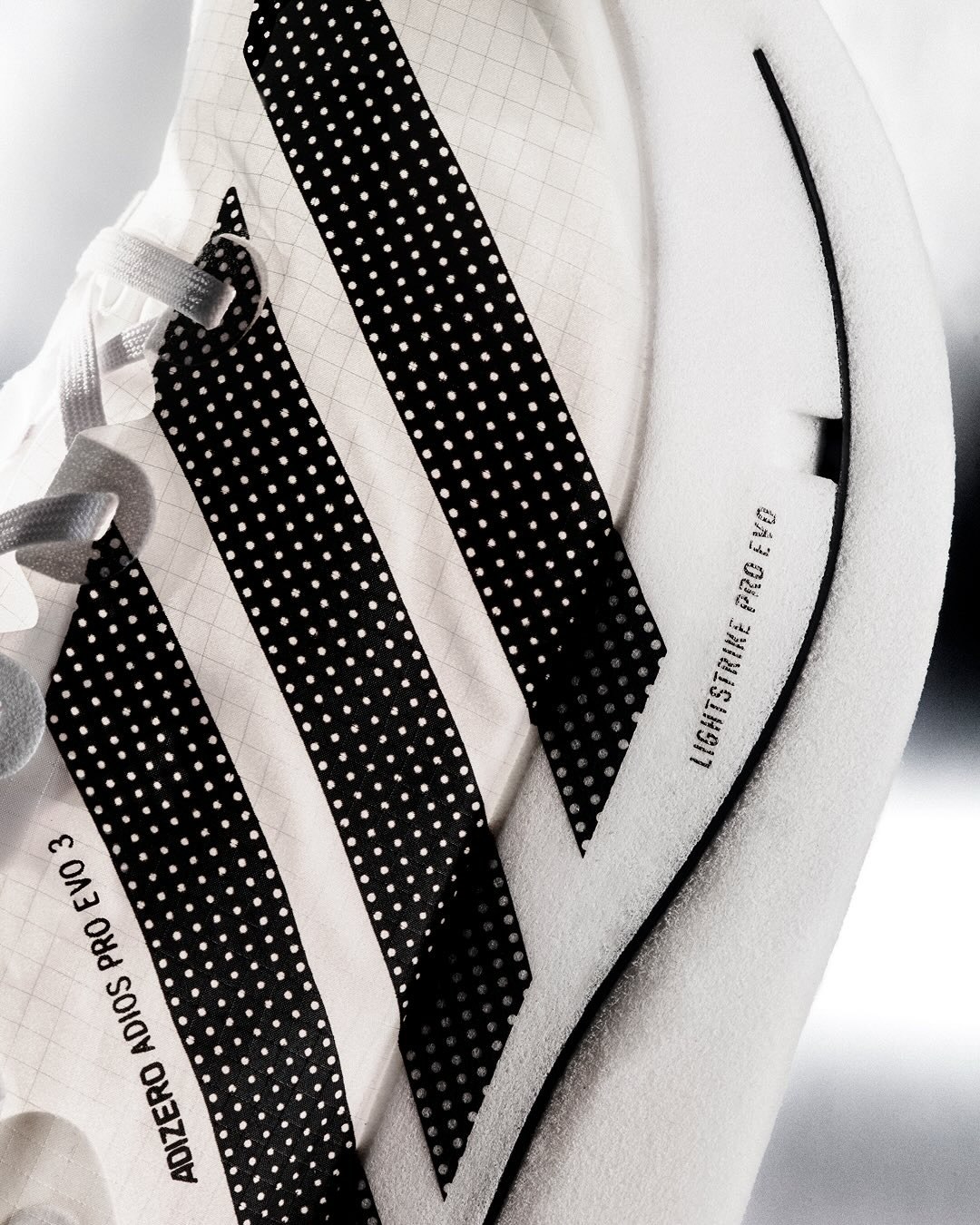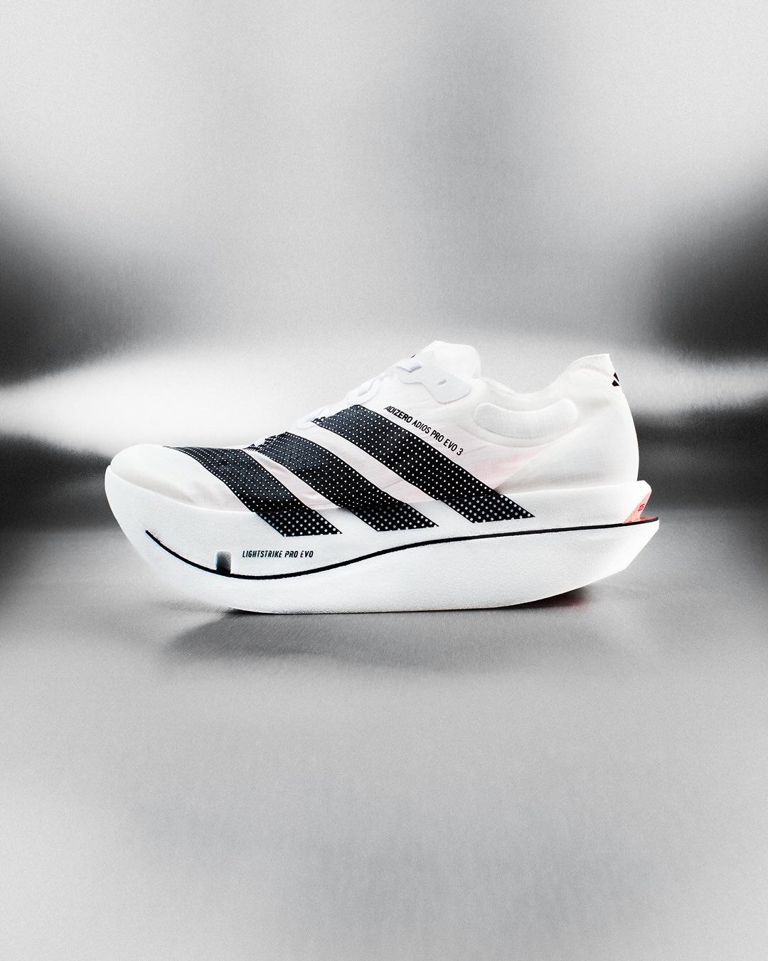Adizero Adios Pro Evo 3 是 Adizero 家族目前最轻、最快的跑鞋,UK 8.5 尺码的重量仅为 97 克。