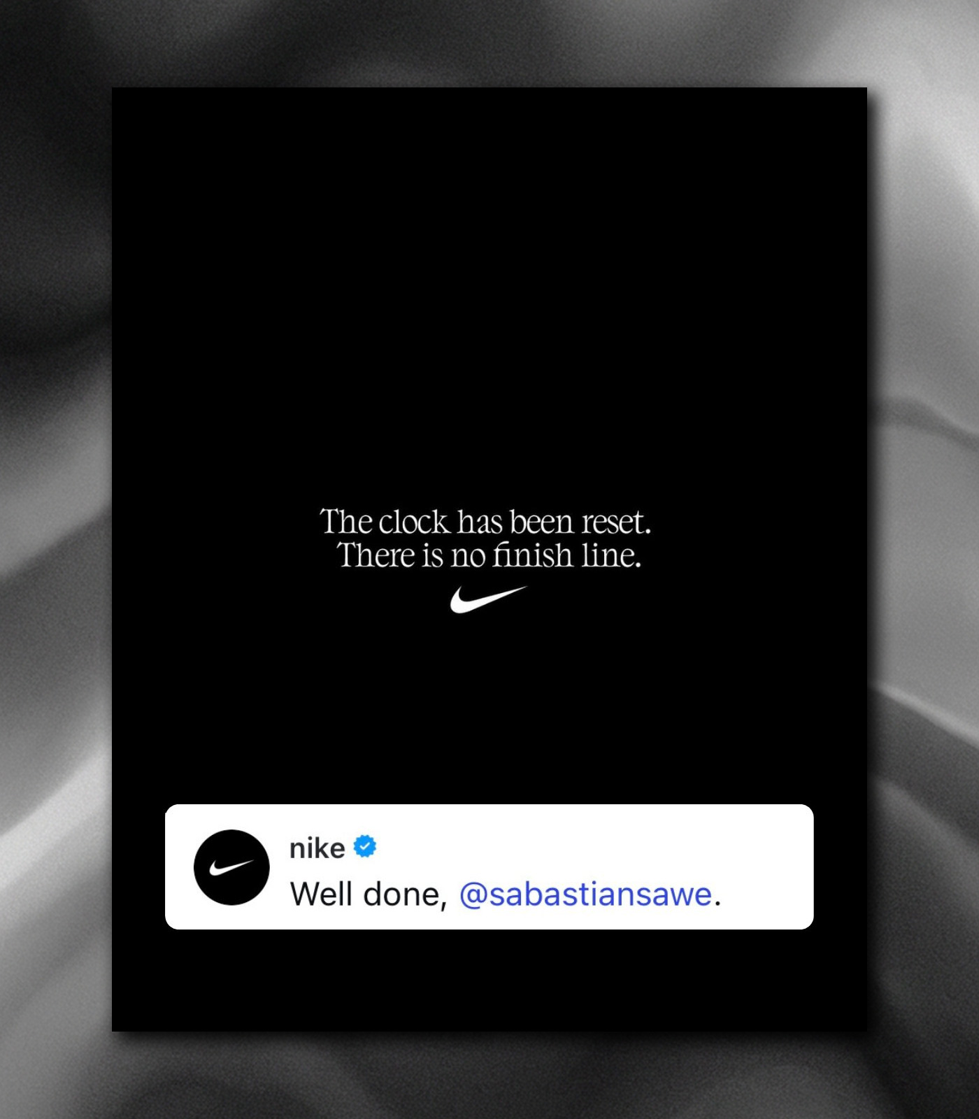 在多年前就以「Breaking 2」为目标的 Nike 在赛后也通过社交媒体发布了相关内容,表示「计时归零,永无终点」,并在评论区祝贺萨巴斯蒂安·萨维取得的历史性突破。
