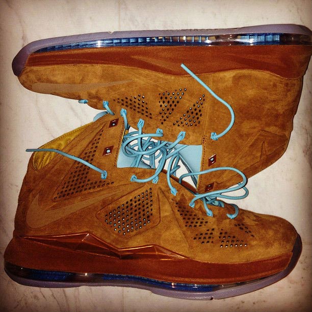 NikeSportswear 在 Lebron 10 "Cork" 造成不小轰动之后又有新动作,早些时候我们也曝光了一款紫色丹宁版本,今天,又一款棕色麂皮版本的 Lebron 10 曝光于网络。从曝光图中我们可以看出,这款版本采用了棕色麂皮材质布满鞋身,再以浅蓝色的鞋带以及大底点缀,配色十分特别,真的是一波未平一波又起啊。目前还没有这款版本市售的消息,感兴趣的朋友情持续关注我们的后续报道。