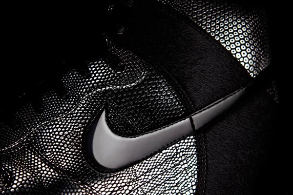 众所周知,全黑的一切代表着纽约特色。该款鞋采用了金属鳞片鞋面设计,搭配鞋后跟黑色马驹毛以及侧面皮革质地的Nike Logo,尽享其华贵外观。