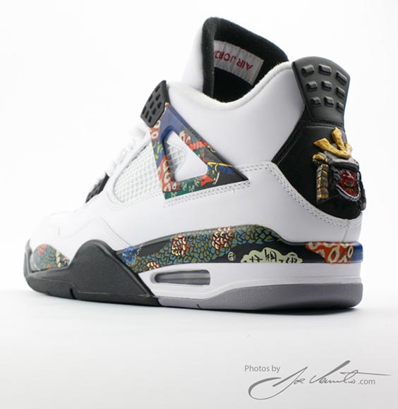 Air Jordan 28 的设计师 Tinker 曾声称自己在设计 AJ28 的时候曾汲取日本武士道文化,因此也有人开玩笑说 Air Jordan 28 的鞋型也很像忍者的战靴。最近,球鞋定制大牌 El Cappy 就也以日本文化为灵感,以大热的 Air Jordan 4 为设计蓝本,打造了这双 Air Jordan 4 “武士” 版本。