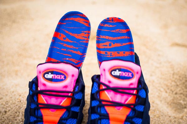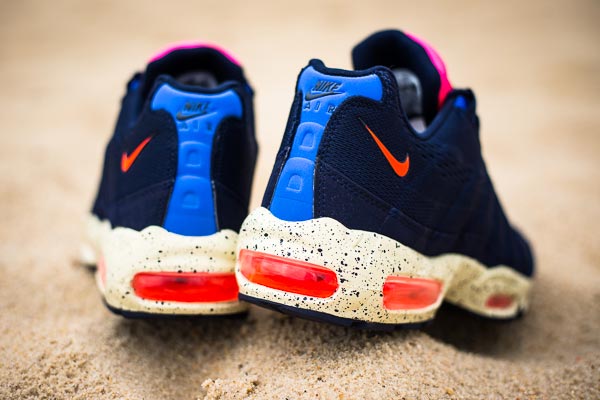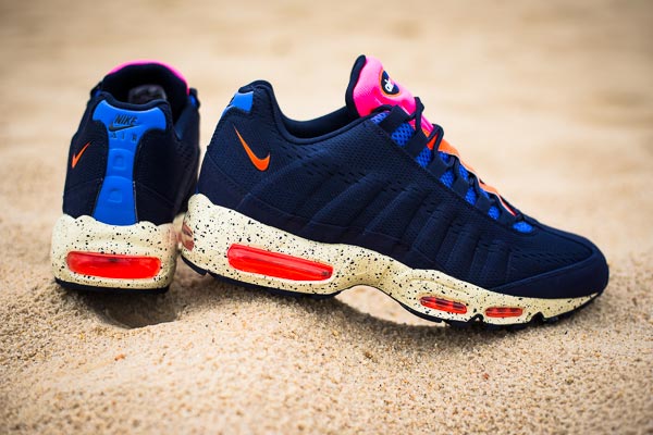 近日 Nike Sportswear 发布了一款以巴西里约热内卢海滩为灵感配色的 Nike Air Max 95 EM 。这款 Nike Air Max 95 EM 采用了蓝黑色工程网面为鞋身基础,再配以橙色、粉色、蓝色的亮两眼细节设计为点缀,最后搭载上犹如沙子般的泼墨设计中底以及海面般的鞋垫,营造出了一股热情的夏日海滩风格。