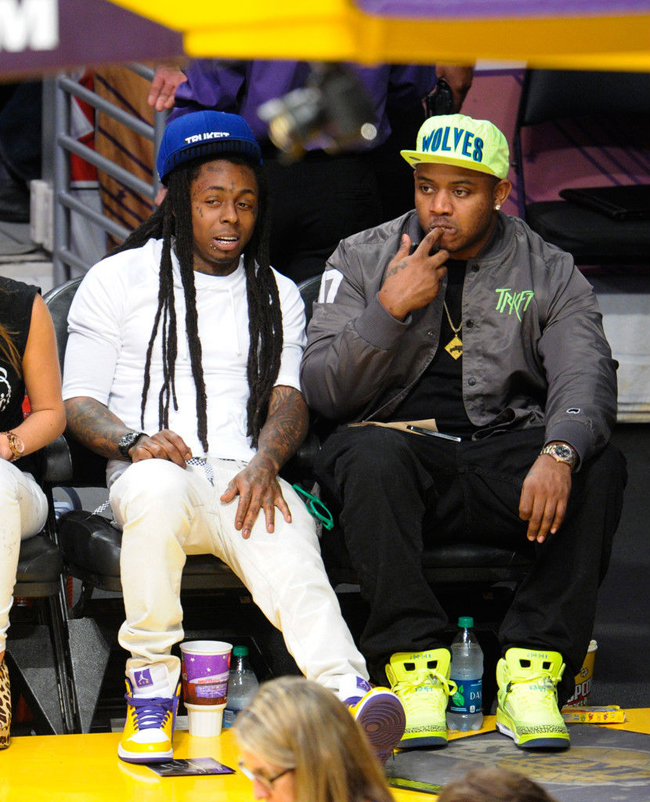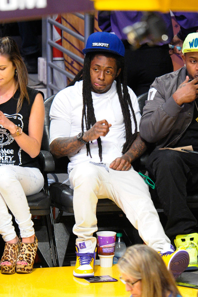 众所周知,著名说唱歌手 Lil Wayne 是一名忠实的湖人球迷,就在昨天,Lil Wayne 现身斯台普斯球馆,助阵湖人与马刺的季后赛对决。当天,Lil Wayne 也穿上了一双 Jordan Brand 最新复刻的 Air Jordan Retro 1 Mid 湖人配色,以此表明其对湖人队的忠心。不知道各位觉得他驾驭的如何?