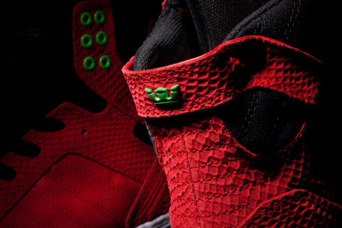 美国人气滑板品牌 Supra 近期又为我们带来了这款 Skytop “Drummond” 配色,鞋款采用了大面积的红色蛇纹材质打造鞋身,延续了品牌夸张的外形设计。再配以黑色的鞋舌、鞋带以及内衬,细节装饰则以绿色点缀,喜欢的朋友可以登录 Supra 官方网站购买,售价为120美元一双。
