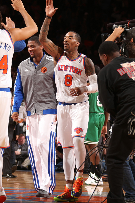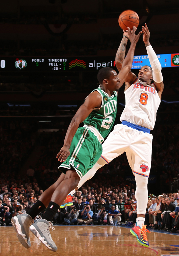 纽约尼克斯得分位 J.R 史密斯是一位不折不扣的天赋异禀的球员,近日他拿到了赛季最佳第六人的称号证明了他在纽约尼克斯队地位,在季后赛尼克斯对阵凯尔特人的比赛中,史密斯上脚了一款 Nike KD 5 Elite “EYBL” PE ,EYBL是青少年篮球精英联赛的含义,鞋身由众多配色构成,这款鞋为史密斯带来了好运,比较遗憾的是,据悉此鞋款将不会市售。大家想看到更多更好的季后赛鞋款么,敬请期待后续报道。