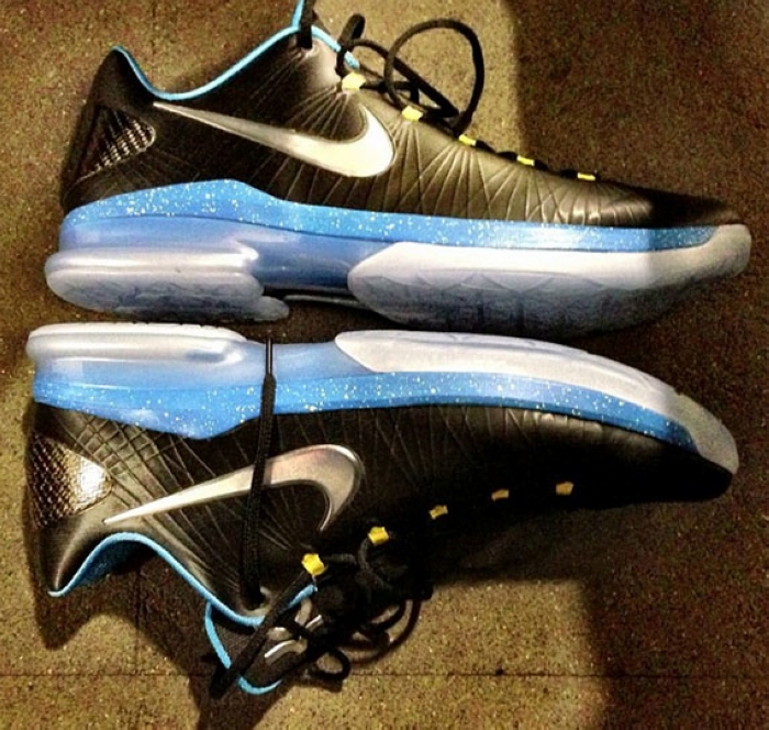 近日这双黑蓝配色的Nike KD 5 Elite图片曝光于网络,据悉在未来的比赛中凯文-杜兰特将会上脚这款黑蓝配色版本进行实战。鞋面以黑色为主,搭配蓝色内衬,蓝色泼墨斑点中底装饰和透明的水晶外底,值得一提的是在鞋身运用金色鞋带扣以及银色鞋身Swoosh,整体在这样的金银组合下更显犀利气质。