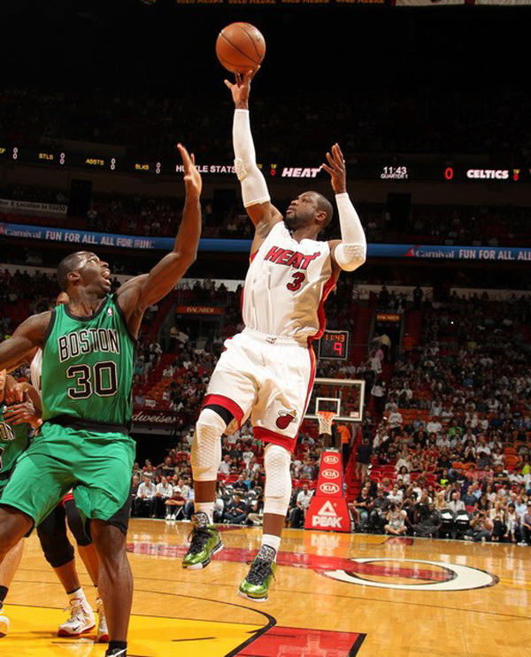 在昨天热火战胜凯尔特人的比赛中,热火三巨头纷纷复出,除了勒布朗穿了一款从未曝光过的 Nike Lebron 10 Elite 之外,好兄弟韦德也穿着了一双从未曝光过的李宁韦德之道。与勒布朗的 Lebron 10 Elite 如出一辙,这款韦德之道也采用了绿色为主体,而且采用了亮面材质,黑色的鞋舌上还布满了白色泼墨设计,整体效果极为炫目。