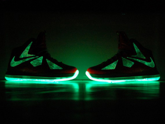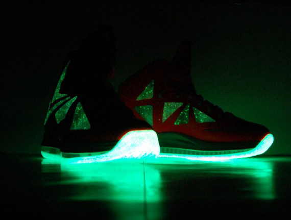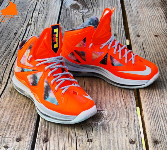 著名球鞋定制团队 GourmetKickz 最近以 Lebron 10 为设计蓝本,为我们带来了一款全新的 Lebron 10 “Big Bang-Alike” (宇宙大爆炸)版本。其设计灵感自然来源于 Lebron 9 的全明星配色,因此你可以看到,这款鞋同样采用了橙色的鞋身为主体,鞋面以及内衬则加载了颇为流行的银河星空图案,美轮美奂。但是精彩的还在后头,从图片中我们可以看出,这款鞋在黑暗环境下大底还带有夜光效果,着实令人感到惊艳。