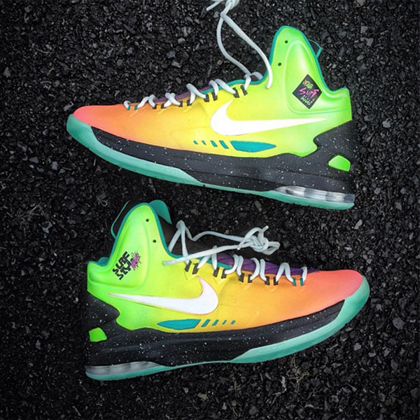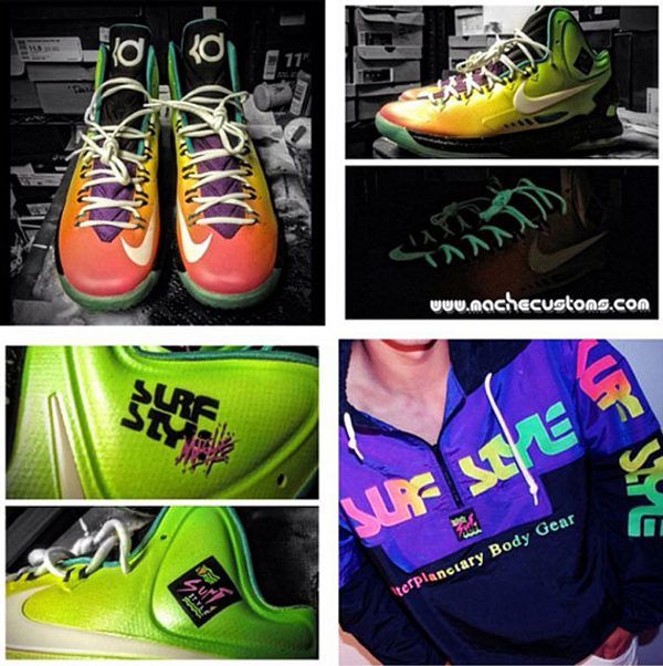 随着Nike KD 5 复活节配色以及 Nike KD 5 Elite 的放出,此次定制大师 Mache 又将给我们带来一款全新的定制版 KD5 ,他曾为詹姆斯,韦德,做过球鞋定制,现在开始为杜兰特做球鞋定制了,此鞋款鞋面以渐变彩虹色作为主基调,搭配 Surf Style 的LOGO 点缀,另外值得一提的是此次鞋带采用的是夜光材质,大家觉得此款定制如何呢?各位喜欢么?