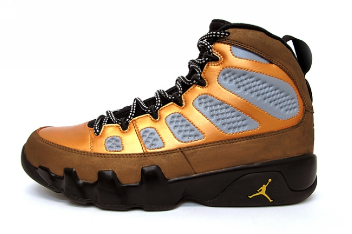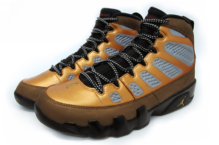 出自Sekure D的定制版本Air Jordan 9“Night Owl”近日出现在网络上,以金色为主色的设计理念,在鞋头处有月牙Logo,表示深夜中金色的月光,喜欢的朋友们可以关注一下这双Air Jordan 9“Night Owl”